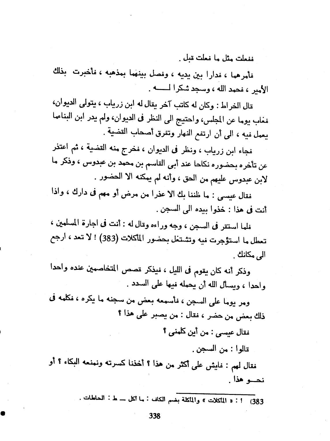 مثل ما فعلت قبل. فأمرهما قراراً بين يديه. وفصل بينهما، بمذهبه. فأخبرت بذلك الأمير. فحمد الله تعالى. وسجد شكراً لله تعالى. قال الخراط: وكان له كاتب آخر يقال له ابن زرياب. يتولى الديوان. فغاب يوماً عن المجلس، واحتيج الى النظر في الديوان، ولم يدر ابن البناء ما يعمل فيه، الى أن ارتفع النهار. وتفرق أصحاب القضية. فجاء ابن زرياب، فنظر في الديوان، فأخرج القضية، ثم اعتذر عن تأخره، بحضوره نكاحاً، عند أبي القاسم بن محمد بن عبدوس. وذكر ما لابن عبدوس عليه من الحق. وأنه لم يمكنه إلا الحضور. فقال له عيسى: ما ظننا بك إلا عذراً من مرض، أوهم في ذلك، وإذا أنت في هذا. فأخذوا بيده الى السجن. فلما استقر في السجن وجه وراءه، وقال له: أنت في إجازة المسلمين، تعطل ما استؤجرت فيه، وتشتغل بحضور الملاكات. لا تعد وارجع الى مكانك. وذكر أنه كان يقوم في الليل، يتذكر قصص المتخاصمين عنده، واحداً واحداً، ويسأل الله تعالى أن يحمله فيها على السداد. ومرّ يوماً على السجن فأسمعه بعض من سجنه ما يكره، فكلمه في ذلك بعض من حضر، وقال من يصبر على هذا. قال عيسى: من أين كلمني؟ قال من السجن. فقال لهم فليس عليّ أكثر من هذا. أخذنا كسوته ونمنعه من البكاء. ونحو هذا.