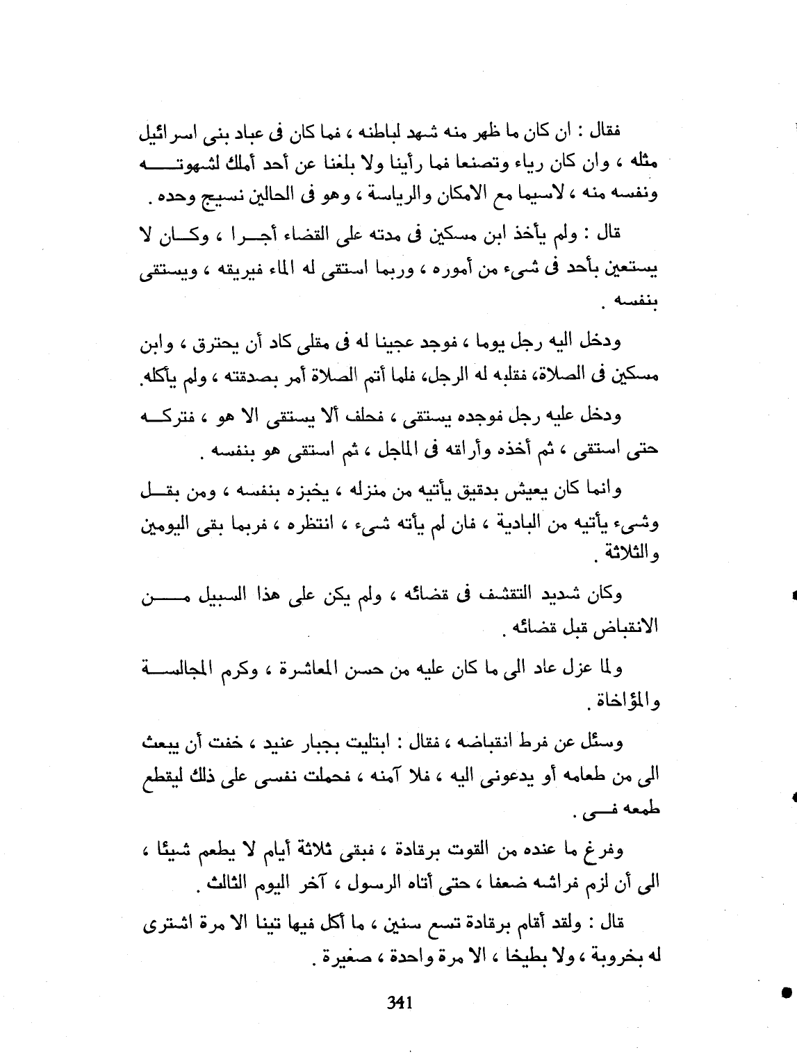 فقال: إن كان ما ظهر منه يشهد لباطنه فما كان في عُبّاد بني إسرائيل مثله. وإن كان رياء أو تصنعاً، فما رأينا ولا بلغنا عن أحد ملك شهوته ونفسه منه. لاسيما مع الإمكان والرياسة. وهو في الحالتين نسيج وحده. قال: ولم يأخذ ابن مسكين في مدته على القضاء أجراً. وكان لا يستعين بأحد في شيء، من أموره. وربما استُقي له الماء، فيريقه، ويستقي لنفسه. وإنما كان بل لنفسه. ودخل عليه رجل يوماً، فوجد له عجيناً في مقلى، كاد أن يحترق، وابن مسكين في الصلاة. فقلبه له الرجل. فلما أتم الصلاة أمر بصدقته، ولم يأكله. ودخل عليه رجل يستسقي، فحلف له أن لا يستقي إلا هو. فتركه حتى استقى. ثم أخذه فأراقه في الماجل. ثم استقى هو بنفسه. وإنما كان يعيش بدقيق، كان يأتيه من منزله، يخبزه بنفسه، وبقل وشيء يأتيه من البادية. فإن لم يأته شيء، انتظره. فربما بقي اليومين والثلاثة بلا طعام. وكان شديد التقشف في قضائه. ولم يكن على هذه السبيل من الانقباض، قبل قضائه. ولما عزل، عاد الى ما كان عليه، من حسن المعاشرة. وكرم المجالسة. والمؤاخاة. وسئل عن فرط انقباضه، فقال: ابتليت بجبار عنيد. خفت أن يبعث إليّ من طعامه أو يدعوني إليه. فلا آمنه إن امتنعت. فحملت نفسي على ذلك. لينقطع طمعه فيّ. وفرغ ما عنده من القوت برقادة. فبقي ثلاثة أيام، لا يطعم شيئاً. حتى لزم الفراش ضعفاً. حتى أتاه الرسول، آخر اليوم الثالث. قال: ولقد أقام برقادة تسع سنين، ما أكل تيناً - إلا مرة - اشتري له بخروبة. ولا بطيخاً - إلا مرة واحدة - صغيرة.