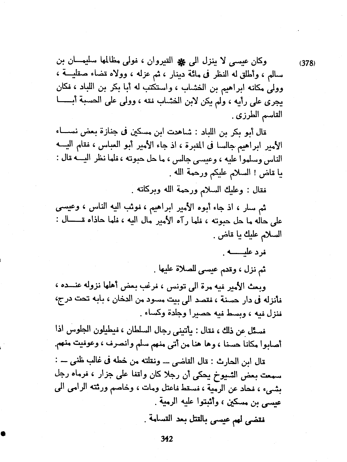 وكان عيسى لا ينزل الى القيروان. فولى مظالمها، سليمان بن سالم، وأطل له النظر في مائة دينار. ثم عزله. وولاه قضاء صقلية. وولي مكانه ابراهيم بن الخشاب، واستكتب له أبا بكر بن اللباد. فكان يجري على رأيه، ولم يكن لابن الخشاب فقه، وولى على الحسبة، أبا القاسم الطرزي، قال أبو بكر اللباد: شاهدت ابن مسكين في جنازة بعض نساء الأمير ابراهيم، جالساً في المقبرة. إذ جاء الأمير أبو العباس، فقام إليه الناس، وسلموا عليه، وعيسى جالس. ما حل حبوته. فلما نظر إليه. قال: يا قاضي: السلام عليكم ورحمة الله. فقال له: وعليك السلام ورحمة الله وبركاته. ثم سار إذ جاء أبوه ابراهيم، فوقف إليه الناس، وعيسى على حاله، ما حل حبوته. فلما رآه الأمير مال إليه، فلما حاذاه، قال السلام عليك يا قاضي. فردّ عليه. ثم نزل فقدّم عيسى للصلاة عليها، وبعث الأمير به الى تونس، فرغب بعض أهلها في نزوله عنده. فأنزله في دار حسنة، فقصد الى بيت مُسوّدٍ من الدخان، بابه تحت درج، فنزل فيه فسئل عن ذلك. فقال: يأتيني رجال السلطان فيطيلون الجلوس، إذا أصابوا مكاناً حسناً. وهاهنا من أتى منهم، سلّم وانصرف. وعوفيت منهم. قال القاضي رحمه الله تعالى: ونقلته من خط ابن الحارث: سمعت بعض الشيوخ يحكي، أن رجلاً كان واقفاً على جزار فرماه رجل بشيء، فحاد عن الرمية، فسقط، فاعتل، فمات، وخاصم ورثته، الرامي الى عيسى بن مسكين. فأثبتوا عليه الرمية. فقضى لهم عيسى بالقتل، بعد القسامة.