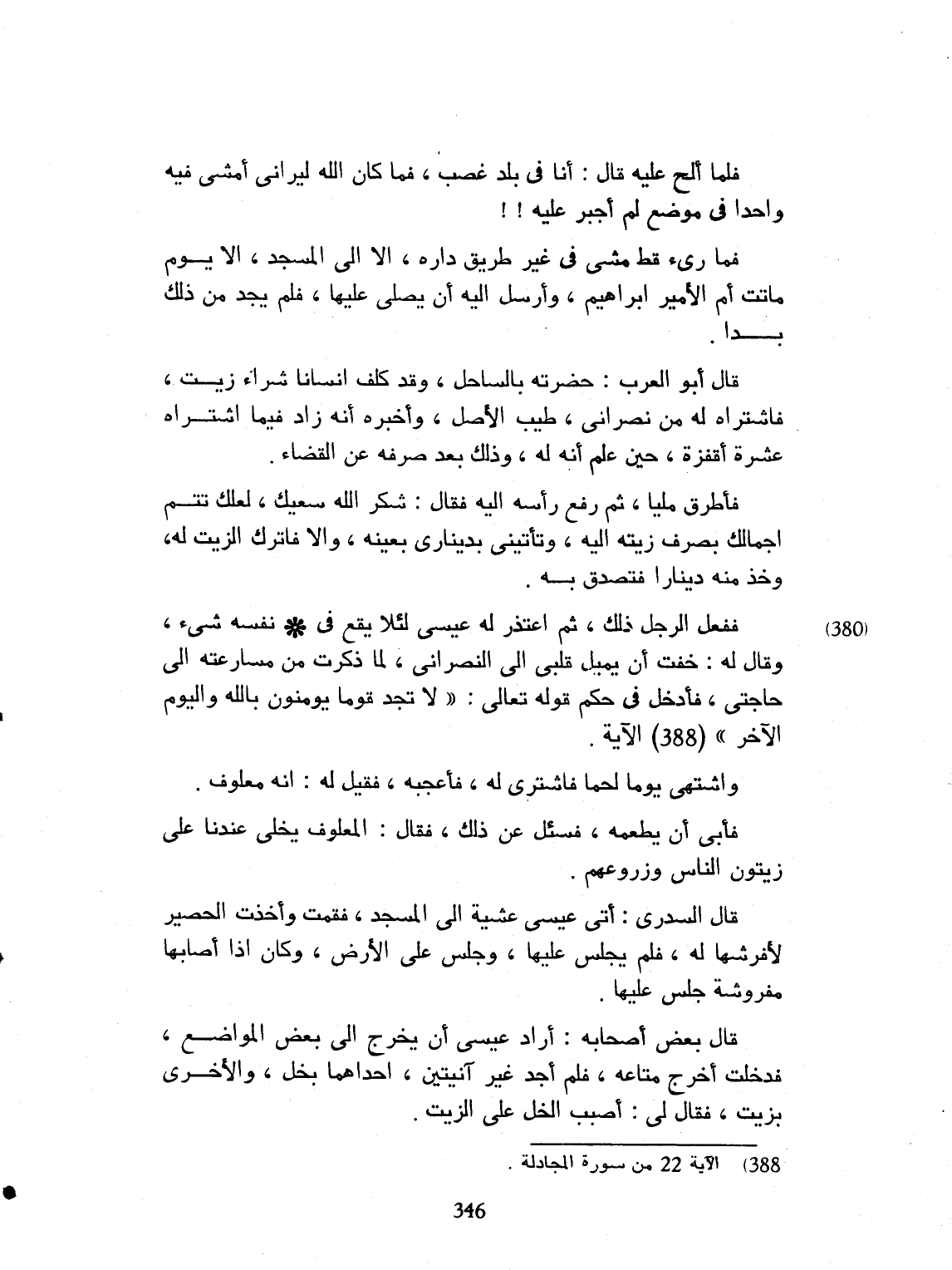 فلما ألحوا عليه، قال: إني في بلد غصب. فما كان الله ليراني أمشي فيه، واحداً في موضع لم أجبر عليه. فما رئي قط يمشي في غير طريق داره. ولا أتى المسجد إلا يوم موت أم الأمير ابراهيم، وأرسل إليه، أن يصلي عليها. فلم يجد بداً من ذلك. قال أبو العرب: حضرت بالساحل، وقد كلّف إنساناً شراء زيت، فاشترى له من نصراني زيتاً طيب الأصل، وأخبره أنه زاده فيما اشتراه عشرة أقفزة. حين علم أنه له. وذلك بعد صرفه عن القضاء. فأطرق ملياً ثم رفع رأسه إليه، فقال: شكر الله سعيه. لعلك تتم أجمالك بصرف زيته إليه، وتأتيني بديناري بعينه. وإلا فأترك الزيت له. وخذ منه ديناراً. وتصدق به.