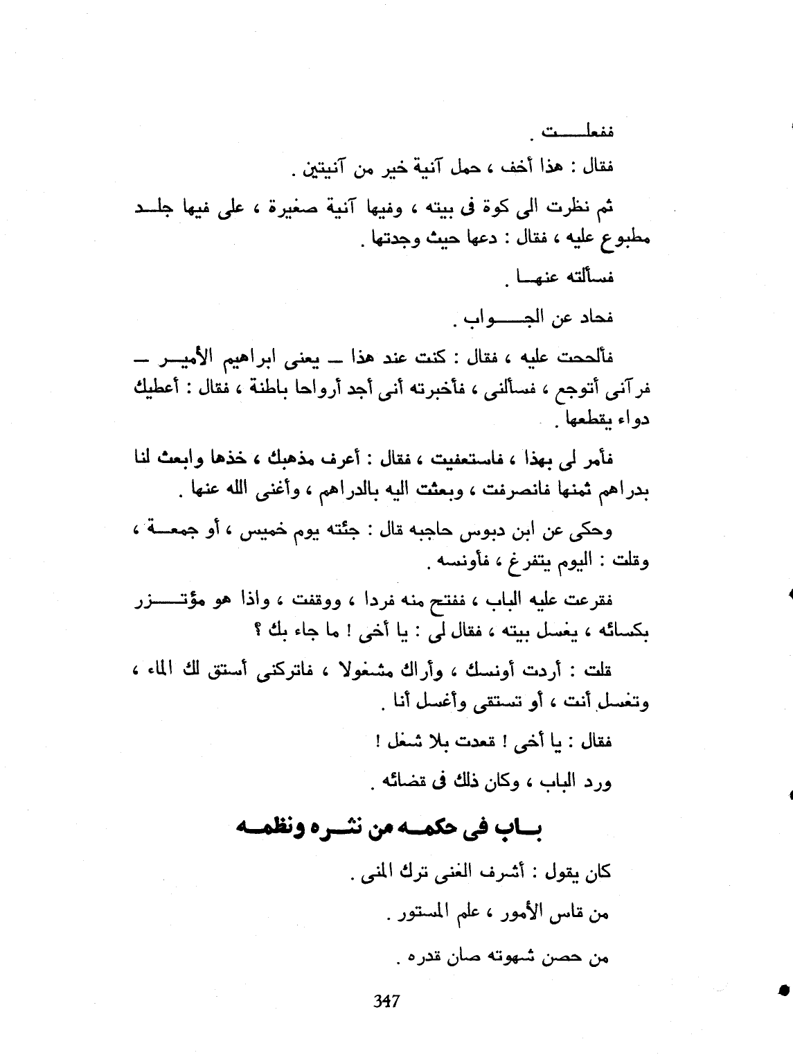 فقال: هذا أخف. حمل آنية واحدة، من حمل اثنتين. ثم نظرت الى كوة في بيته، وفيها آنية صغيرة على فمها جلد مطبوع عليه. فقال: دعها حيث وجدتها. فسألته عنها، فحاد عن الجواب، وألححت عليه. فقال: كنت عند هذا. يعني: ابراهيم الأمير. فرآني أتوجع فسألني فأخبرته أني أجد رواحاً باطنة. فقال: أعطيك دواء يقطعها. فأمرني بهذا. فاستعفيت. فقال: أعرف مذهبك. خذها وأتني بدرهم ثمنها. فانصرفت. وبعثت إليه بالدرهم، وأغناني الله سبحانه عنها. وحكى ابن دبوس حاجبه، قال: جئته يوم خميس أو جمعة. وقلت: اليوم يتفرغ فأؤنسه. فقرعت عليه الباب، ففتح منه فرداً، ووقفت. فإذا هو مؤتزر بكسائه، يغسل جبته. فقال لي: يا أخي، ما جاء بك. قلت: أردت أن أؤنسك، وأراك مشغولاً. فاتركني أستقي لك الماء، وتغسل أنت. أو تستقي وأغسل أنا. فقال: يا أخي، قعدت بلا شغل. ورد الباب. وكان ذلك كله في قضائه رحمه الله تعالى.