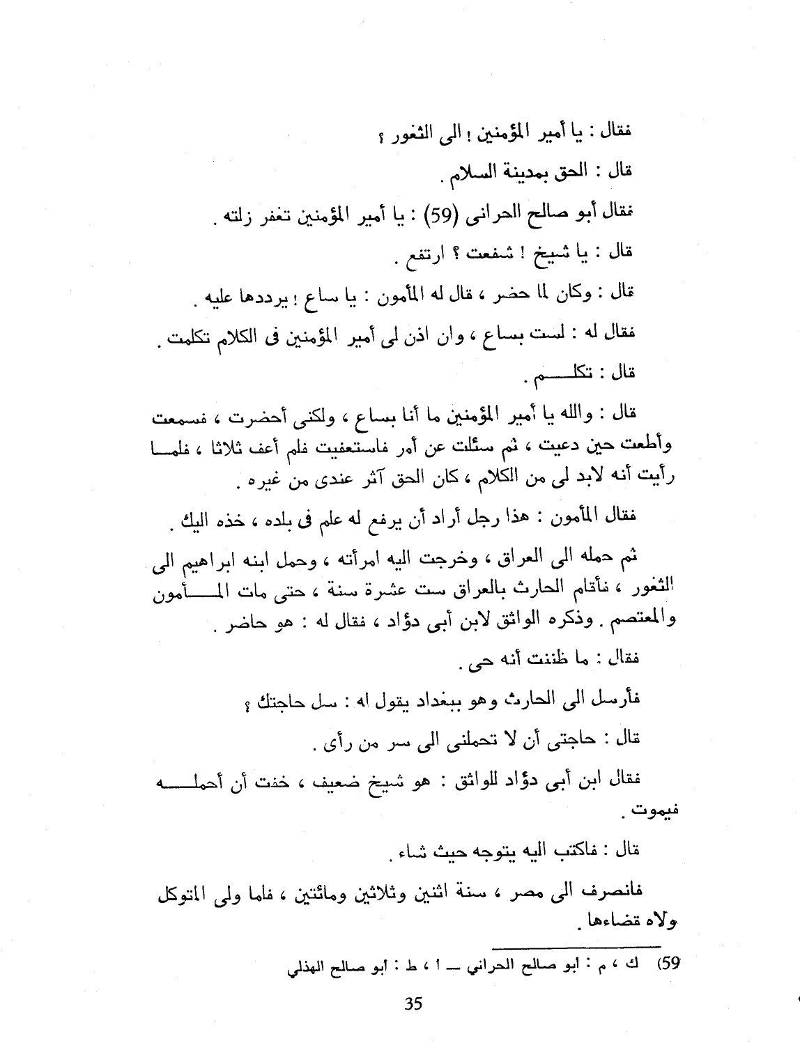 فقال: يا أمير المؤمنين، إلى الثغور. قال، إلحق بمدينة السلام. فقال أبو صالح الحراني: يا أمير المؤمنين تغفر زلته. فقال يا شيخ شفعت فارتفع. قال: كان لما حضر قال له المأمون: يا ساعي، يرددها عليه. فقال له: لست بساعي، وإن أذن أمير المؤمنين في الكلام تكلمت. قال: تكلم. قال: والله يا أمير المؤمنين ما أنا بساعي، ولكني أحضرت، فسمعت وأطعت حين دعيت. ثم سئلت عن أمر فاستعفيت. فلم أعف ثلاثاً. فلما رأيت أنه لابد لي من الكلام، كان الحق آثر عندي من غيره. قال المأمون هذا رجل أراد أن يرفع له علم في بلده، خذه إليك. ثم حمله إلى العراق. وخرجت إليه امرأته، وحمل ابنه إبراهيم إلى الثغور. فأقام الحارث بالعراق ستة عشر سنة، حتى مات المأمون، والمعتصم. وذكره الواثق لابن أبي داؤد. فقال له: هو حاضر. فقال: ما ظننت أنه حي. فأرسل إلى الحارث وهو ببغداد، يقول له: سل حاجتك.