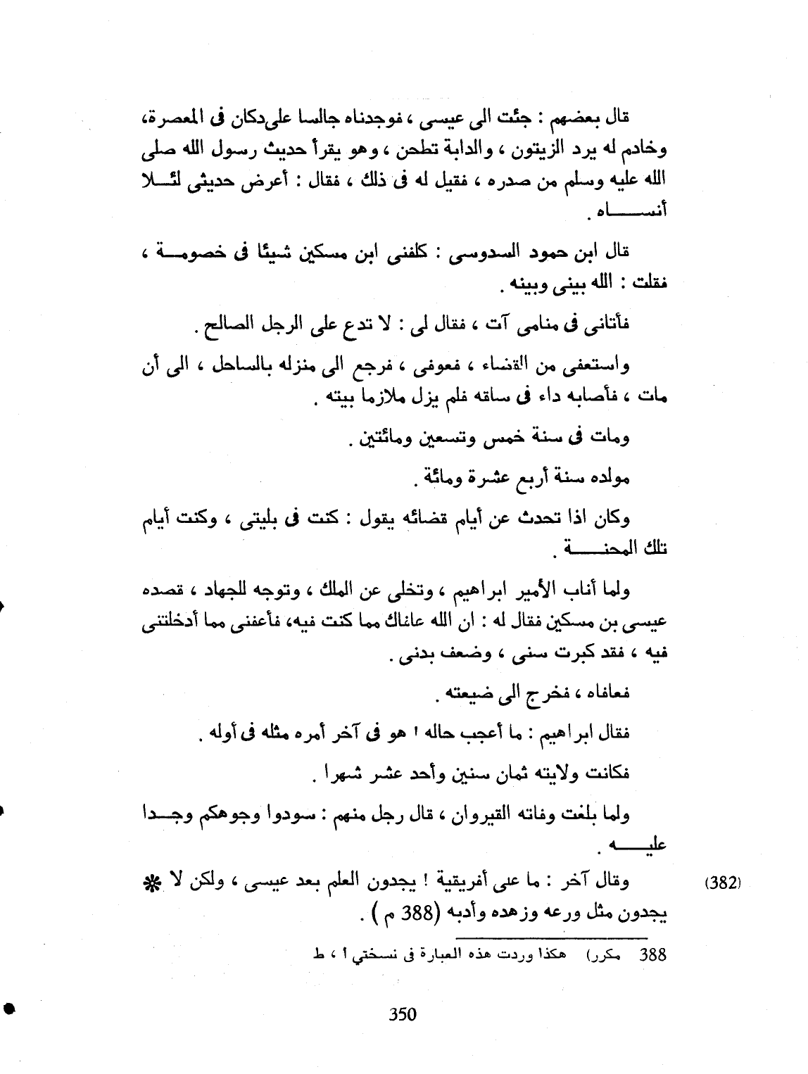 قال بعضهم: جئت الى عيسى بن مسكين فوجدته جالساً، على دكان في المعصرة. وخادم له يرد الزيتون، والدابة تطحن، وهو يقرأ أحاديث رسول الله صلى الله عليه وسلم من صدره. فقيل له في ذلك. فقال: أعرض حديثي لئلا أنساه. قال ابن حماد السوسي: كلفني ابن مسكين، يوماً في خصومة شيئاً. فقلت: الله بيني وبينه. فأتاني في منامي، آت، فقال لي: لا تدعو على الرجل الصالح. فاستعفى من القضاء، فعوفي. فرجع الى منزله بالساحل. الى أن مات. فأصابه داء في ساقه. فلم يزل ملازماً به. ومات رحمه الله سنة خمس وسبعين ومائتين مولده سنة أربع عشرة ومائة. وكان إذا تحدث عن أيام قضائه يقول: كنت في بليتي. وكنت أيام تلك المحنة. ولما تاب الأمير ابراهيم، وتخلى عن الملك، وتوجه الى الجهاد، قصده عيسى بن مسكين، فقال له: إن الله عافاك مما ابتلاك به. فاعفني، مما أدخلتني فيه. فقد كبر سني، وضعف بدني، فعافاه. فخرج الى ضيعته. فقال ابراهيم: ما أعجب حاله؟ هو في آخر أمره، مثله في أوله. فكانت ولايته ثمان سنين وأحد عشر شهراً. ولما بلغت وفاته القيروان قال رجل منهم: سودوا وجوهكم. توفي. ووجدوا عليه. وقال آخر وا على إفريقية. تجدون العلم بعد عيسى. ولا تجدون مثل ورعه، وزهده، وأدبه.