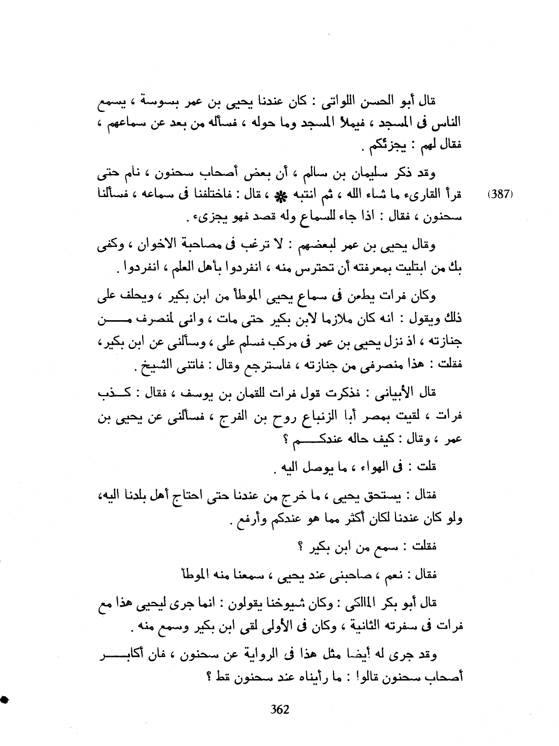 قال الزويلي: كان يحيى بن عمر ينصب له كرسي في الجامع، للسماع. فيجلس عليه، ليسمع الناس. وما علمت أنه عمل ذلك غيره. قال أبو الحسن اللواتي: كان عندنا يحيى بن عمر بسوسة، يسمع الناس في المسجد، ويمتلئ المسجد، وما حوله. فسأله من بعُدَ عن إسماعهم فقال: يجزئهم. وقد ذكر سليمان بن سالم أن بعض أصحاب سحنون، نام حتى قرأ القارئ ما شاء الله. ثم انتبه. قال: فاختلفنا في سماعه. فسألنا سحنون فقال: إذا جاء للسماع وله قصد، فهو يجزئه. وقال يحيى بن عمر لبعضهم. لا ترغب في مصاحبة الإخوان، وكفاك من ابليت بمعرفته، أن تحترس منه. انفردوا بأهل العلم. وكان فرات، يطعن في سماع يحيى، الموطأ من ابن بكير، ويحلف على ذلك، ويقول: إنه كان ملازماً لابن بكير، حتى مات. وإني لأنصرف من جنازته، إذ نزل يحيى بن عمر، في موكب فسلّم علي، وسألني عن ابن بكير. فقلت هذا منصرفي من جنازته. فاسترجع، وقال: فاتني الشيخ. قال الإبياني: فذكرت قول فرات للقمان بن يوسف، فقال: كذب فرات. لقيت بمصر أبا الزنباع، روح بن فرج، فسألني عن يحيى بن عمر، قال: كيف حاله عندكم؟ قلت في الهواء، وما نصل إليه. قال: يستحق يحيى، وما خرج من عندنا حتى احتاج أهل بلدنا إليه. ولو كان عندنا، لكان أكثر مما هو عندكم، وأرفع. فقلت: سمع من ابن بكير. قال: نعم. صاحبي عند يحيى. سمعنا منه الموطأ. قال أبو بكر المالكي: وكان شيوخنا يقولون: إنما جرى هذا ليحيى مع فرات في سفرته الثانية. وكان في الأولى لقي ابن بكير، وسمع منه. ولقد جرى له أيضاً، مثل هذا، في الرواية عن سحنون. فإن أكابر أصحاب سحنون قالوا: ما رأيناه عند سحنون قط.