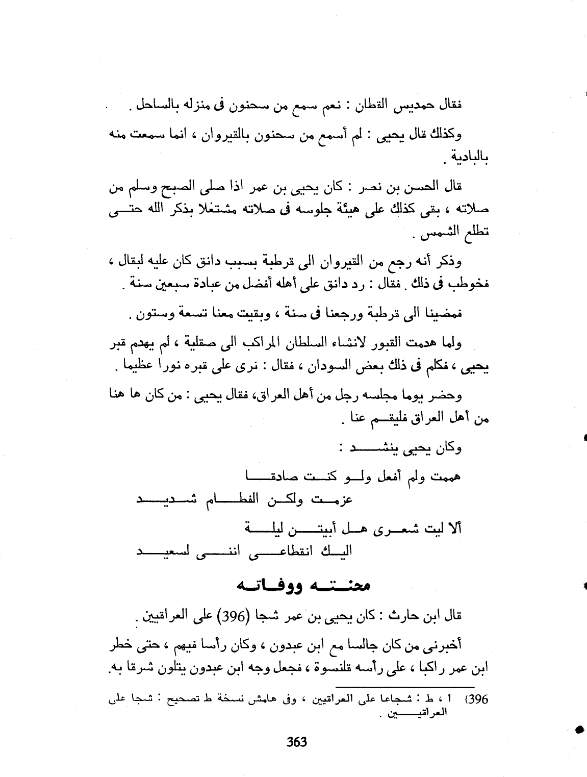 قال حمديس القطان: نعم سمع من سحنون في منزله بالساحل. وكذلك قال يحيى: لم أسمع من سحنون بالقيروان. إنما سمعت بالبادية. قال الحسن بن نصر: كان يحيى بن عمر إذا صلى الصبح وسلم، من صلاته، بقي كذلك على هيئته كجلوسه في صلاته مشتغلاً بذكر الله عز وجل، حتى تطلع الشمس. وذكر أنه رجع من القيروان الى قرطبة، بسبب دانق كان عليه، لبقال فخوطب في ذلك، فقال: ردُّ دانق على أهله أفضل من عبادة سبعين سنة. فمضينا الى قرطبة، ورجعنا في سنة. وبقيت معنا تسعة وستون. ولما هدمت القبور لإنشاء السلطان، المراكب الى صقلية. لم يهدم قبر يحيى. فكلم في ذلك بعض السودان، فقال: رأيت على قبره نوراً عظيماً. وحضر يوماً مجلسه، رجل من أهل العراق، فقال يحيى: من كان هاهنا من العراق فليقم عنا. وكان يحيى رحمه الله ينشد: