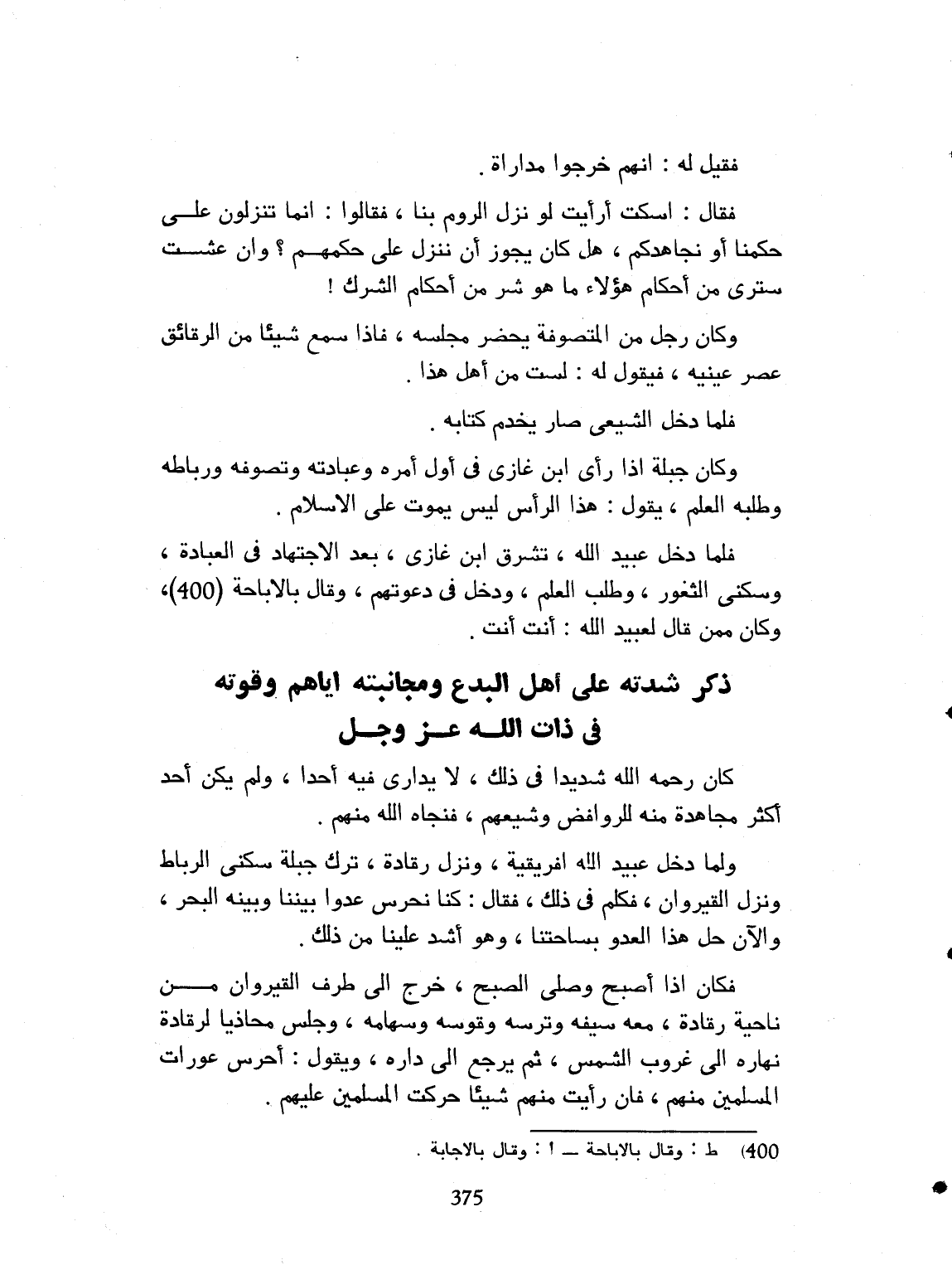 كان رحمه الله تعالى، شديداً في ذلك. لا يداري فيه أحداً. ولم يكن أحد أكثر مجاهدة منه للروافض، وشيعهم. فنجّاه الله تعالى منهم. ولما دخل عبيد الله إفريقية، ونزل رقادة. ترك جبلة سكنى الرباط. ونزل القيروان. فكلم في ذلك. فقال: كنا نحرس عدواً بيننا وبينه البحر. والآن حلّ هذا العدو بساحتنا. وهو أشد علينا من ذلك. فكان إذا أصبح، وصلى الصبح، خرج الى طرف القيروان من ناحية رقادة، ومعه سيفه، وترسه، وقوسه، وسهامه، وجلس محاذياً لرقادة، نهاره. الى غروب الشمس. ثم يرجع الى داره. ويقول احرس عورات المسلمين منهم. فإذا رأيت منهم شيئاً، حركت المسلمين عليهم.