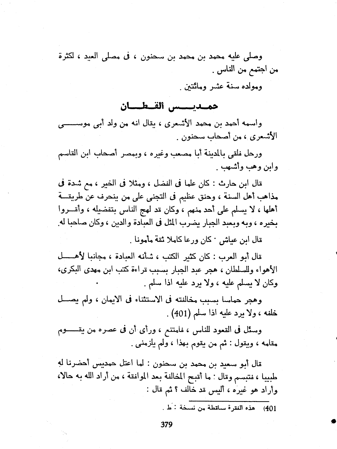 واسمه أحمد بن محمد الأشعري. رحمه الله تعالى. يقال إنه من ولد أبي موسى الأشعري. من أصحاب سحنون. رحل فلقي بالمدينة أبا مصعب، وغيره. وبمصر أصحاب ابن القاسم، وابن وهب وأشهب. قال ابن حارث: كان علماً في الفضل، ومثلاً في الخير، مع شدته في مذاهب أهل السنة. وغلوّ عظيم، في النهي على من ينحرف عن طريقة أهلها. لا يسلم على أحد منهم. وكان قد لهج الناس بتفضيله، وأقروا بخيره. وبه، وبعبد الجبار يضرب المثل، في العبادة والدين. وكان صاحباً له. قال ابن عياش: كان ورعاً، كاملاً ثقة، مأموناً. قال أبو العرب: كان كثير الكتب. شأنه في العبادة. مجانباً لأهل الأهواء، والسلطان. هجر عبد الجبار بسبب قراءته كتب ابن مهدي البكري. وكان لا يسلم عليه، ولا يرد عليه إذا سلّم. وهجر حمّاساً بسبب مخالفته في الاستثناء في الإيمان. ولم يصلّ خلفه، وسئل في القعود للناس، فامتنع. ورأى أن في عصره من يقوم مقامه، ويقال إنه قال: ثم من يقوم بهذا؟ ويلزمني. قال أبو سعيد بن محمد بن سحنون: لما اعتلّ حمديس، أحضرنا له طبيباً. فتبسّم، وقال: ما أقبح المخالفة بعد الموافقة. من أراد الله به حالاً، وأراد هو غيره، فقد خالف. ثم قال: