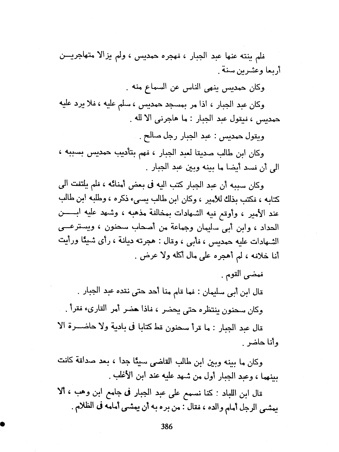 فلم يلتفت الى كتابه. فكتب بذلك للأمير، وكان ابن طالب يسمي ذكره. وطلبه ابن طالب عند الأمير، وأوقع فيه الشهادة بمخالفة مذهبه. وشهد عليه ابن الحداد وابن أبي سليمان وجماعة من أصحاب سحنون. واستدعى الشهادة عليه، حمديس. فأبى. وقال: هجرته ديانة. رأى شيئاً، ورأيت أنا خلافه. لم أهجره على مال أكله. أو عرض. فمضى القوم. قال ابن أبي سليمان: فما قام منا أحد حتى نفر عبد الجبار، وكان سحنون ينتظره حتى يحضر. فإذا حضر أمر القارئ، فقرأ. قال عبد الجبار: ما قرأ سحنون كتاباً قط، في باذية ولا حاضرة، إلا وأنا حاضر. وكان ما بينه وبين أبي طالب القاضي، بيناً جداً بعد صداقة، كانت بينهما. وعبد الجبار، أول من شهد عليه عند ابن الأغلب. قال ابن اللباد: وكنا نسمع على عبد الجبار في جامع ابن وهب، ألا يمشي الرجل أمام والده. فقال من برّه به، أن يمشي أمامه في الظلام.