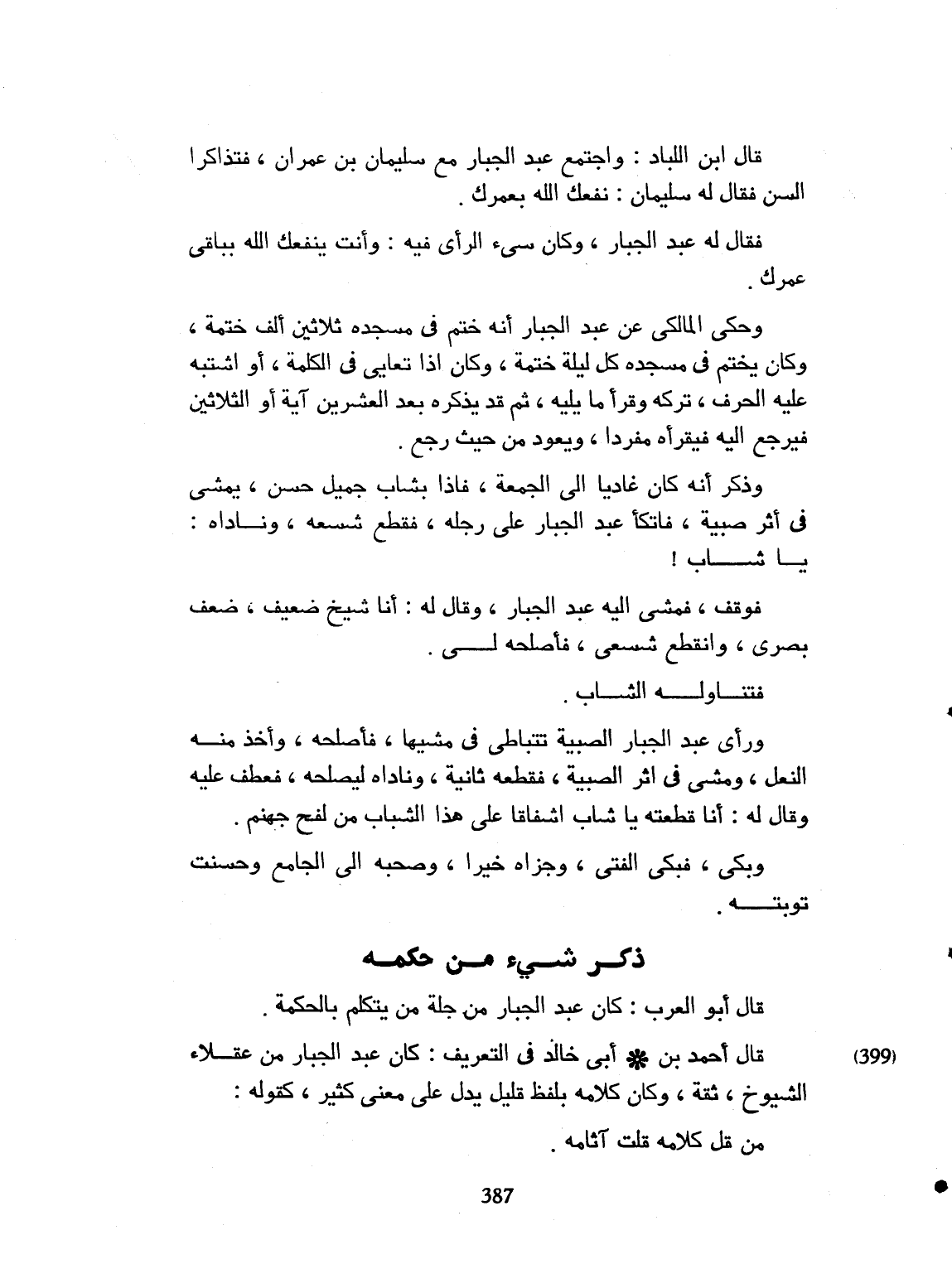 قال ابن اللباد: واجتمع عبد الجبار مع سليمان بن عمران، يتذاكران السنّ. فقال له سليمان: نفعك الله بعمرك. فقال له عبد الجبار: وكان سيئ الرأي فيه. وأنت نفعك الله ومتعك بباقي عمرك. وحكى المالكي عن عبد الجبار، أنه ختم في مسجد، ثلاثين ختمة. وكان يختم في مسجده، كل ليلة ختمة. وكان إذا تعايا في الكلمة أو اشتبه عليه، الحرف. تركه. وقرأ، ما يليه. ثم قد يذكره بعد العشرين آية أو الثلاثين فيرجع إليه ويقرأه، مفرداً. ويعود من حيث رجع. وذكر أنه كان غادياً الى الجمعة، فإذا بشاب جميل حسن البشرة، يمشي في أثر صبية. فاتكأ عبد الجبار، فقطع شسعه، وناداه: يا شاب. فوقف، ومشى إليه عبد الجبار، وقال له: أنا شيخ ضعف بصري، وانقطع شسعي، فأصلحه. وأخذ منه النعل فأصلحه.