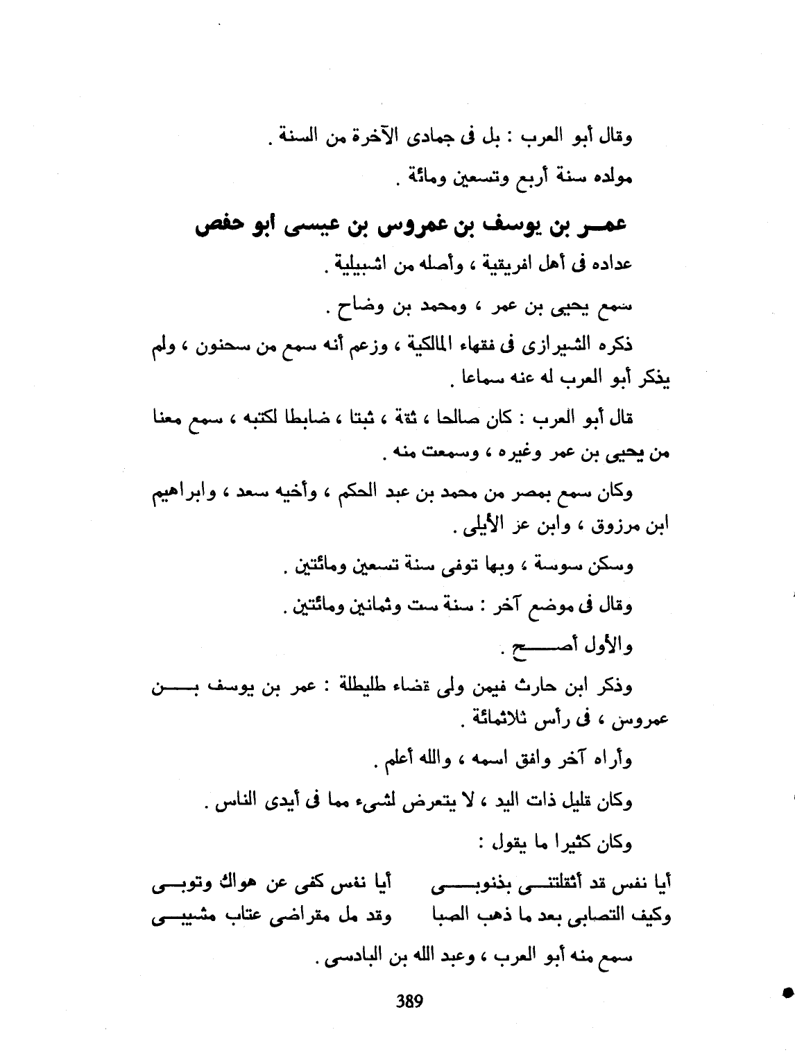 أبو حفص رحمه الله تعالى. عداده في أهل إفريقية. وأصله من إشبيلية. سمع يحيى بن عمر، ومحمد بن وضاح. ذكره الشيرازي في عداد فقهاء المالكية. وزعم أنه سمع من سحنون، ولم يذكر أبو العرب عنه سماعه. قال أبو العرب: كان صالحاً ثقة، ثبتاً ضابطاً سمع من سحنون ولم يذكر يحيى بن عمر ولا غيره. وسمعت منه. وكان سمع بمصر، من محمد بن عبد الحكم، وأخيه سعد، وابراهيم بن مرزوق، وابن عزيز الإيلي. وسكن سوسة. وتوفي بها، رحمه الله تعالى. سنة ست وثمانين ومائتين. والأول أصح؟ وذكر ابن حارث، فيمن ولي قضاء طليطلة: عمر بن يوسف بن عمر بن يوسف بن عمر في رأس ثلاثمائة سنة. وأراه آخر، وافق اسمه. والله سبحانه أعلم. وكان قليل ذات اليد، لا يتعرض لشيء مما في أيدي الناس. وكان كثيراً ما يقول: