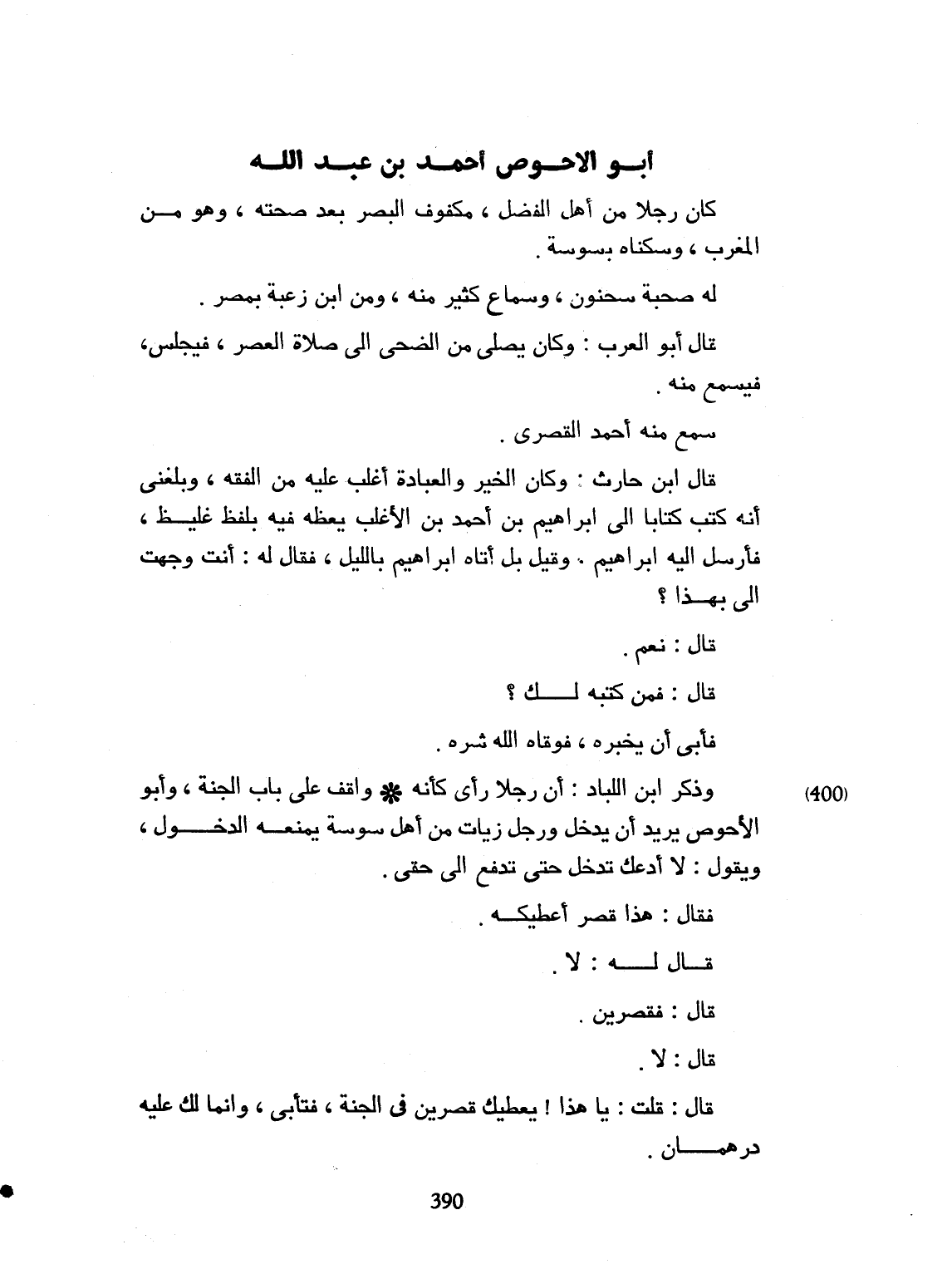 كان رجلاً من أهل الفضل، مكفوف البصر، بعد صحة. وهو من المغرب. وسكناه بسوسة. له صحبة مع سحنون. وسمع كثيراً منه، ومن ابن زُغبة بمصر، قال أبو العرب: وكان يصلي من الضحى الى صلاة العصر، ثم يجلس، يسمع منه. سمع منه أحمد القصري. قال ابن حارث: وكان الخير والعبادة أغلب عليه من الفقه. وبلغني أنه كتب كتاباً، الى ابراهيم بن أحمد بن الأغلب يعظه فيه، بلفظ غليظ. فأرسل إليهم ابراهيم. وقيل: بل أتاه ابراهيم بباليل، فقال له: أنت وجهت إليّ هذا. قال: نعم. قال فمن كتبه لك. فأبى أن يخبره. فوقاه الله شرّه. وذكر ابن اللباد: أن رجلاً رآه كأنه واقف على باب الجنة. وأبو الأحوص يريد أن يدخل الجنة، ورجل زيات من أهل سوسة، يمنعه الدخول، ويقول: لا أدعك تدخل، حتى تدفع إليّ حقي. قال: هذا قصر أعطيكه. قال: لا. قال: فقصرين. قال: لا. قلت أيا هذا، أيعطيك قصرين في الجنة وتأبى. وإنما لك عليه درهمان
