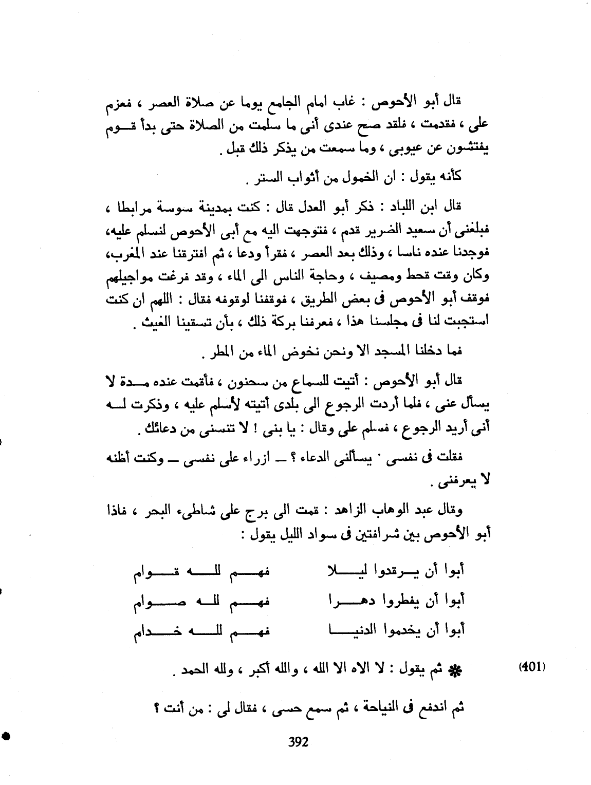 قال أبو الأحوص: غاب إما الجامع يوماً عن صلاة العصر، فعزم علي، فتقدمت. فلقد صحّ عندي أني ما سلمت من الصلاة حتى بدأ قوم يفتشون عن عيوبي. وما سمعت من يذكر ذلك قبل، كأنه يقول: إن الخمول من أسباب الستر. قال ابن اللباد: ذكر أبو العدل، قال: كنت بمدينة سوسة مرابطاً. فبلغني أن سعيداً الضرير قدم، فتوجهت إليه مع أبي الأحوص، أسلّم عليه. فوجدناه عنده ناساً. وذلك بعد العصر. فدعا وقرأ. ثم افترقنا بعد المغرب. وكان وقت قحط ومصيف، وحاجة الناس الى الماء. وقد فرغت مواجلهم. فوقف أبو الأحوص في بعض الطريق، فوقفنا لوقوفه. فقال: اللهم إن كنت استجبت لنا في مجلسنا هذا، فعرفنا بركة ذلك، بأن تسقينا الغيث. فما دخلنا المسجد إلا ونحن نخوض الماء من المطر. قال أبو الأحوص: أتيت للسماع من سحنون، فبقيت عنده مدة، لا يسأل عني، فلما أردت الرجوع الى بلدي، أتيته لأسلم عليه. وذكرت له أني أريد الرجوع. فسلّم عليّ وقال: يا بني لا تنسنا من دعائك. فقلت في نفسي: يسألني الدعاء - أزري على نفسي - وكنت أظنه لا يعرفني. وقال عبد الوهاب الزاهد: قمت على برج، على شاطئ البحر، فإذا أبو الأحوص رحمه الله تعالى، بين شرافتين في سواد الليل يقول: