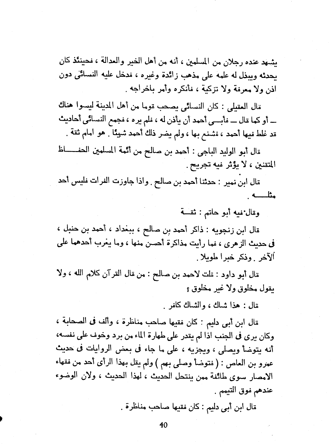 يشهد عنده رجلان من المسلمين، إنه من أهل الخير والعدالة. فحينئذ كان يحدثه ويبذل له علمه على مذهب زائدة وغيره. فدخل عليه النسائي دون إذن ولا معرفة ولا تزكية. فأنكره وأمر بإخراجه. قال العقيلي: كان النسائي يصحب قوماً من أهل المدينة، ليسوا هناك. أو كما قال: فأبى أحمد أن يأذن له، فلم يره. فجمع النسائي أحاديث قد غلط فيها أحمد. فشنّع بها. ولم يضر ذلك أحمد شيئاً هو إمام ثقة. قال القاضي أبو الوليد الباجي: أحمد بن صالح من أئمة المسلمين الحفاظ المتقنين. لا يؤثر فيه تجريح. قال ابن نمير: حدثنا أحمد بن صالح: وإذا جاوزت الفرات فليس أحد مثله. وقال فيه أبو حاتم: ثقة. قال ابن زنجويه: ذاكر أحمد بن صالح ببغداد أحمد بن حنبل في حديث الزهري: فما رأيت مذاكرة أحسن منها، وما يطرب أحدهما على الآخر. وذكر خبراً طويلاً. قال أبو داود: قلت لأحمد بن صالح: من قال القرآن كلام الله، ولم يقل مخلوق، ولا غير مخلوق. قال هذا شاك، والشاك كافر. قال ابن أبي دليم: كان فقيهاً صاحب مناظرة. وألف في الصحابة. وكان يرى في الجنب إذا لم يقدر على طهره بالماء من برد وخوف على نفسه، إنه يتوضأ ويصلي، ويجزيه على ما جاء في بعض الروايات في حديث عمرو بن العاص، فتوضأ وصلى بهم. ولم يقل بهذا الرأي أحد من فقهاء الأمصار، سوى طائفة ممن ينتحل الحديث لهذا الحديث. ولأن الوضوء عندهم فوق التيمم. قال ابن أبي دليم: وكان فقيهاً صاحب مناظرة،