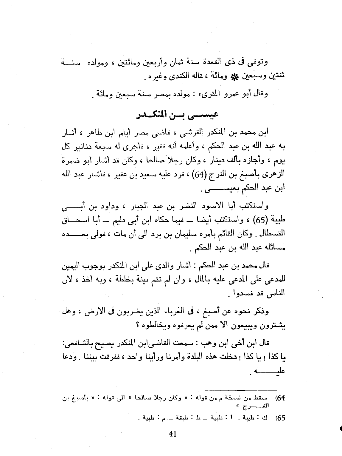 ابن محمد بن المنكدر القرشي. قاضي مصر أيام ابن طاهر. أشار به عبد الله بن عبد الحكم، وأعلمه أنه فقير، فأجرى له سبعة دنانير كل يوم. وأجازه بألف دينار، وكان رجلاً صالحاً، وكان قد أشار أبو ضمرة الزهري بأصبغ بن الفرج فرد عليه سعيد بن عفير، فأشار عبد الله بن عبد الحكم بعيسى واستكتب أبا الأسود النضر بن عبد الجبار، وداود بن أبي طيبة، واستكتي أيضاً فيما حكاه ابن أبي دليم: أبا إسحاق القسطال. وكان القائم بأمره، سليمان بن برد، إلى أن مات. فولى بعده مسائله عبد الله بن عبد الحكم. قال محمد بن عبد الحكم: أشار والدي على ابن المنكدر بوجوب اليمين للمدعي على المدعى عليه، بالمال. وإن لم يقم بينة بخطله. وبه أخذ الناس، وقد فسدوا. وذكر نحوه عن أصبغ في الغرباء الذين يضربون في الأرض، وهل يشترون ويبيعون إلا ممن لم يعرفوه، ويخالطوه. قال ابن أخي ابن وهب: سمعت القاضي ابن المنكدر يصيح بالشافعي: يا كذا يا كذا، دخلت هذه البلدة وأمرنا ورأينا واحد، ففرّقت بيننا، ودعا عليه.