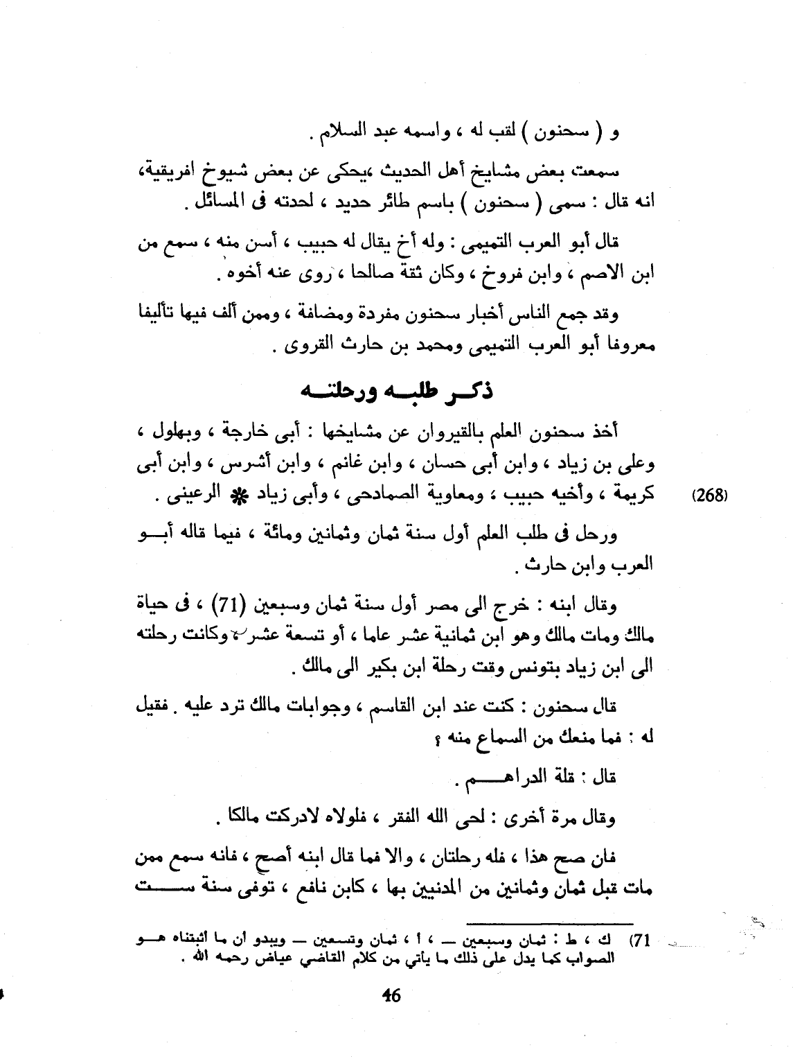 وسحنون، لقب له. واسمه عبد السلام. سمعت بعض مشائخ أهل الحديث يحكي عن بعض شيوخ إفريقية، أنه قال: سمي سحنون باسم طائر حديد لحدّته في المسائل. قال أبو العرب التميمي: وله أخ، يقال له حبيب أسن منه. سمع من ابن الأصم وابن فروخ، وكان ثقة صالحاً، روى عنه أخوه. وقد جمع الناس أخبار سحنون مفردة، ومضافة وممن ألف فيها تأليفاً معروفاً: وقال أبو العرب التميمي، ومحمد بن حارث القروي.