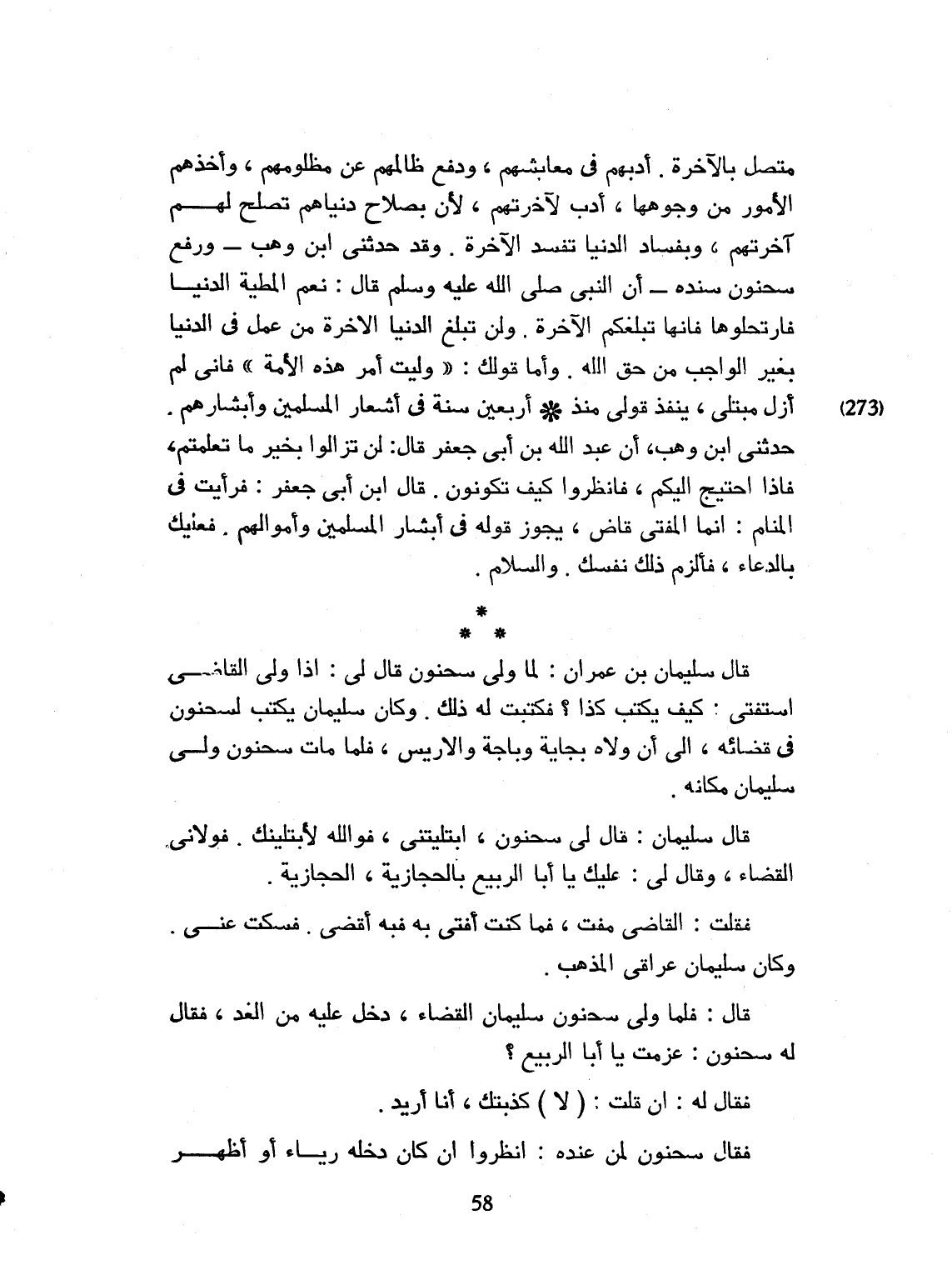 متصل بالآخرة. أؤدبهم في معاملتهم، ودفع ظالمهم عن مظلومهم، وأخذهم الأمور من وجوهها، أدب لأخرتهم. لأن بصلاح دنياهم لهم آجرتهم. وبفساد الدنيا تفسد الآخرة. وقد حدثني ابن وهب، ورفع سحنون سنده إلى النبي صلى الله عليه وسلم، قال: نعم المطية الدنيا، فارتحلوا، فإنها تبلغكم الآخرة. ولن تبلغ الدنيا الآخرة من عمل في الدنيا بغير الواجب من حق الله. وأما قولك وليت أمر هذه الأمة، فإني لم أزل متبلي ينفذ قولي، منذ أربعين سنة، في أشعار المسلمين وأبشارهم. حدثني ابن وهب: أن عبيد الله بن أبي جعفر قال: لن تزالوا بخير ما تعلمتم. فإذا احتيج إليكم فانظروا كيف تكونوا. قال ابن أبي جعفر فرأيت في المنام، إنما المفتي قاض يجوز قوله، في أبشار المسلمين وأموالهم. فعليك بالدعاء. فألزم ذلك نفسك والسلام. قال سليمان بن عمران: لما ولي سحنون قال لي: إذا القاضي السعي كيف يكتب كذا. فكتب له ذلك. وكان سليمان يكتب لسحنون في قضائه، إلى أن ولاه بجاية وباجة الأربُس. فلما مات سحنون ولي سليمان مكانه. قال سليمان: قال لي سحنون: ابتليتني. فوا الله أيبتلينك فولاني القضاء وقال لي: عليك يا أبا الربيع بالحجازية الحجازية.