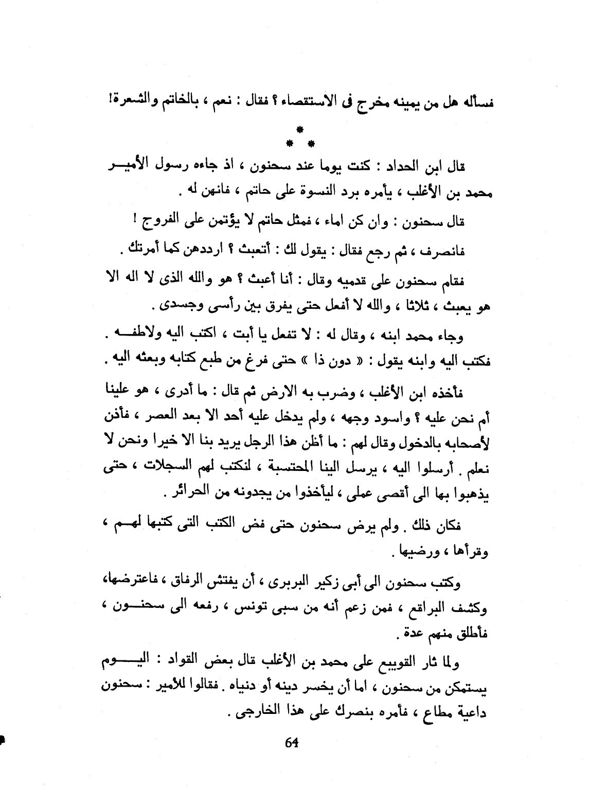 فسأله هل من يمينه مخرج في الاستقصاء؟ فقال: نعم، بالخاتم والشعرة قال ابن الحداد: كنت يوماً عند سحنون، إذ جاءه رسول الأمير محمد بن الأغلب، يأمره برد النسوة على حاتم. فإنهن له. قال سحنون إن كن إماء فمثل حاتم لا يؤتمن على الفروج. فانصرف ثم رجع. فقال: يقول لك: لا تعبث. ارددهن، كما أمرتك. فقام سحنون على قدميه، وقال: إنما يعبث هو، والله الذي لا إله إلا هو، يعبث، ثلاثاً. والله لا أفعل، حتى يفرق بين رأسي وجسدي. وجاء محمد ابنه، يقول دون ذا. لا تفعل يا أبت. اكتب إليه ولاطفه: فكتب إليه وابنه وقال له حتى فرغ من طبع كتابه. وبعث إليه. فأخذه ابن الأغلب وضرب به الأرض، ثم قال: ما أدري هو علينا أن نحن عليه. واسود وجهه ولم يدخل عليه أحد، إلى بعد العصر. فأذن لأصحابه بالدخول، وقال لهم: ما أظن هذا الرجل يريد بنا إلا خيراً، ونحن لا نعلم. أرسلوا إليه، يرسل إلينا المحتسبة، لنكتب لهم السجلات، حتى يذهبوا بها إلى أقصى عملي، ليأخذوا من يجدوه من الحرائر. فكان ذلك. ولم يرض سحنون حتى فض الكتب التي كتبها لهم، وقرأها، ورضيها. وكتب سحنون إلى أبي زكي البربري: أن يفتش الرفاق فاعترضها، وكشف البراقع. فمن زعم أنه من سبي تونس، رفعه إلى سحنون فأطلق منهم عدة. ولما ثار القويع على محمد ابن الأغلب، قال بعض القواد: اليوم نستمكن من سحنون، إما يخسر دينه، أن دنياه. فقالوا للأمير: سحنون داعية مطاع، فأمره بنصرك على هذا الخارجي.