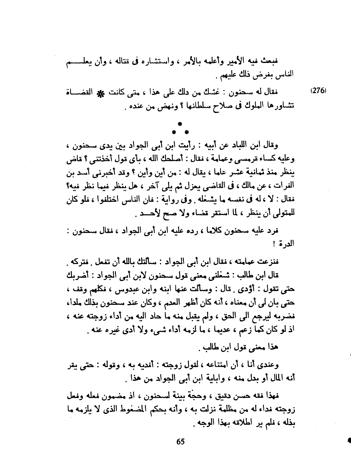 فبعث فيه الأمير، وأعلمه بالأمر واستشاره في قتاله، وإن يعلم الناس بعرض ذلك عليهم. فقال له سحنون: غشك من دلك على هذا. متى كانت القضاة تشاورها الملوك في صلاح سلطانها. ونهض من عنده. وقال ابن اللباد، عن أبيه: رأيت ابن أبي الجواد بين يدي سحنون، وعليه كساء قرمسي وعمامة. فقال: أصلحك الله بأي قول أخذتني. قاض ينظر منذ ثمانية عشر عاماً. فقال له: من اين، وأين. وقد أخبرني أسد بن الفرات عن مالك، في القاضي يعزل ثم يلي آخر: هل ينظر فيما ينظر فيه. فقال: لأن له في نفسه ما يشغله. وفي رواية فإن الناس اختلفوا. فلو كان للمتولي أن ينظر، لما استقر قضاء ولا صح لأحد. فرد عليه سحنون كلاماً، رده عليه ابن أبي الجواد. فقال سحنون: الدرة. فنزعت عمامته. فقال ابن أبي الجواد: سألتك بالله أن تفعل. فتركه. قال ابن طالب: اشغلني معنى قول سحنون لابن أبي الجواد أضربك حتى تقول أؤدي. قال وسألت معنى قول سحنون لابن أبي الجواد أضربك حتى تقول أؤدي. قال وسألت عنها ابنه وابن عبدوس، فكلهم وقف، حتى بان لي أن معناه: أنه كان أظهر العدم. وكان عند سحنون ذلك. فضربه ليرجع إلى الحق