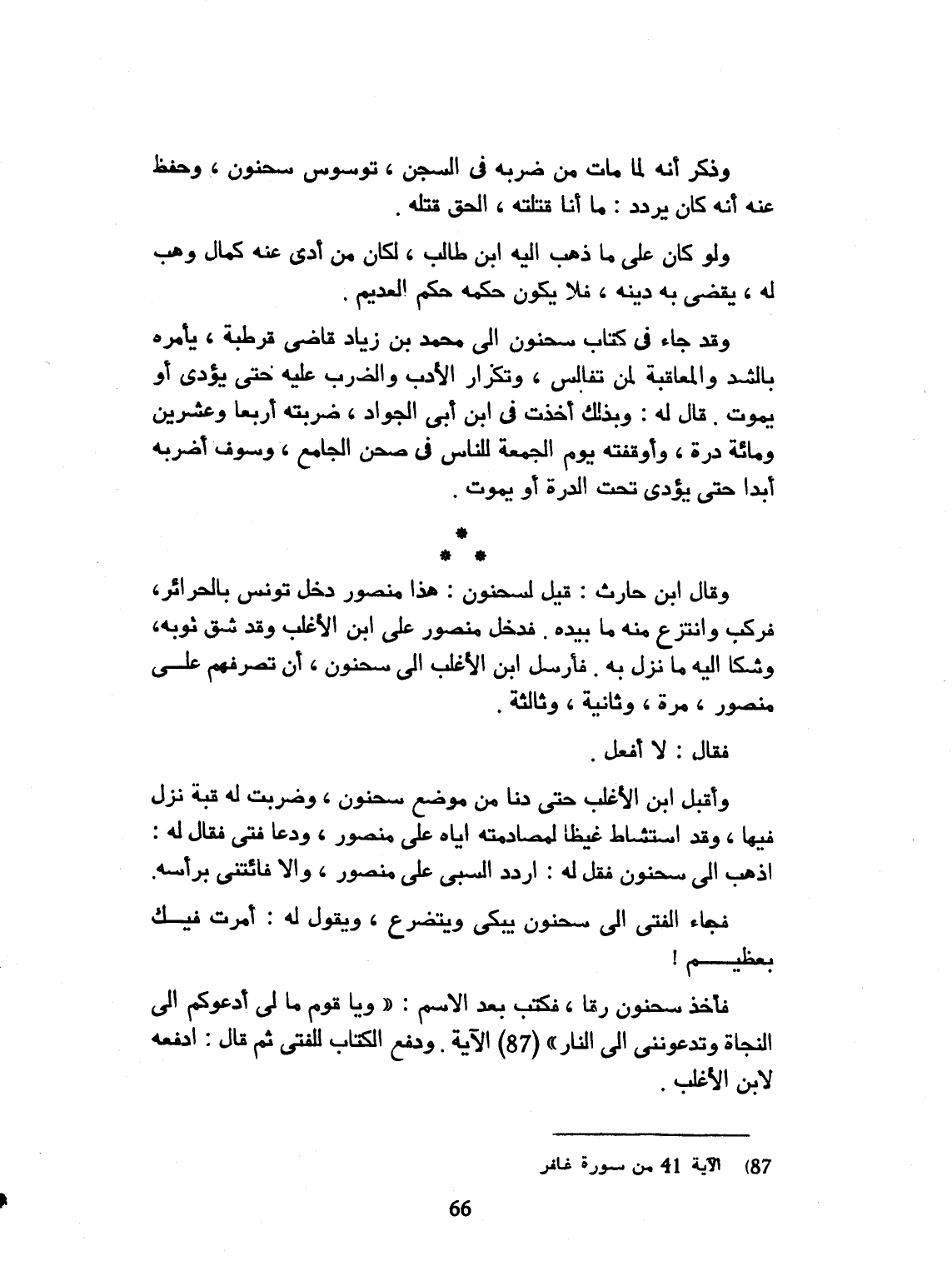 وذكر أنه لما مات من ضربه في السجن، توسوس سحنون، وحفظ عنه، أنه كان يردد: ما أنا قتلته. الحق قتلة. ولو كان على ما ذهب إليه، ابن طالب، لكن من أدى عنه كمال وهب له. يقضي به دينه، فلا يكون حكمه بحكم العديم. وقد جاء في كتاب سحنون إلى محمد بن زياد، قاضي قرطبة، يأمره بالشد والمعاقبة لمن تفالس، وتكرار الأدب والضرب عليه، حتى يؤدي أو يموت. قال أبي: وبذلك أخذت في ابن أبي الجواد، ضربته أربعاً وعشرين، ومائة درة. وأوقفته يوم الجمعة للناس في صحن الجامع. وسوف أضربه أبداً، حتى يؤدي تحت الدرة أو يموت. وقال ابن أبي الحارث قيل لسحنون: هذا منصور دخل من تونس بالحرائر. فركب وانتزع منه ما بيده، فدخل منصور على ابن الأغلب وقد شق ثوبه، وذكر إليه ما نزل به، فأرسل ابن الأغلب إلى سحنون، أن تصرفهم على منصور مرة وثانية وثالثة. فقال: لا أفعل. وأقبل ابن الأغلب حتى دنا من موضع سحنون، وضربت له قبة، نزل فيها، وقد استشاط غيظاً لمصارمته إليه، على منصور، ودعا فتى قال له: اذهب إلى سحنون فقل له: فاردد السبي على منصور، وإلا فأتني برأسه. فجاء الفتى إلى سحنون يبكي ويتضرع ويقول له: أمرت فيك بعظيم. فأخذ سحنون ورقاً فكتب فيه بعد الاسم: ويا قوم ما لي أدعوكم إلى لنجاة وتدعونني إلى النار..... الآية. ودفع الكتاب للفتى، ثم قال: ادفعه لابن الأغلب.