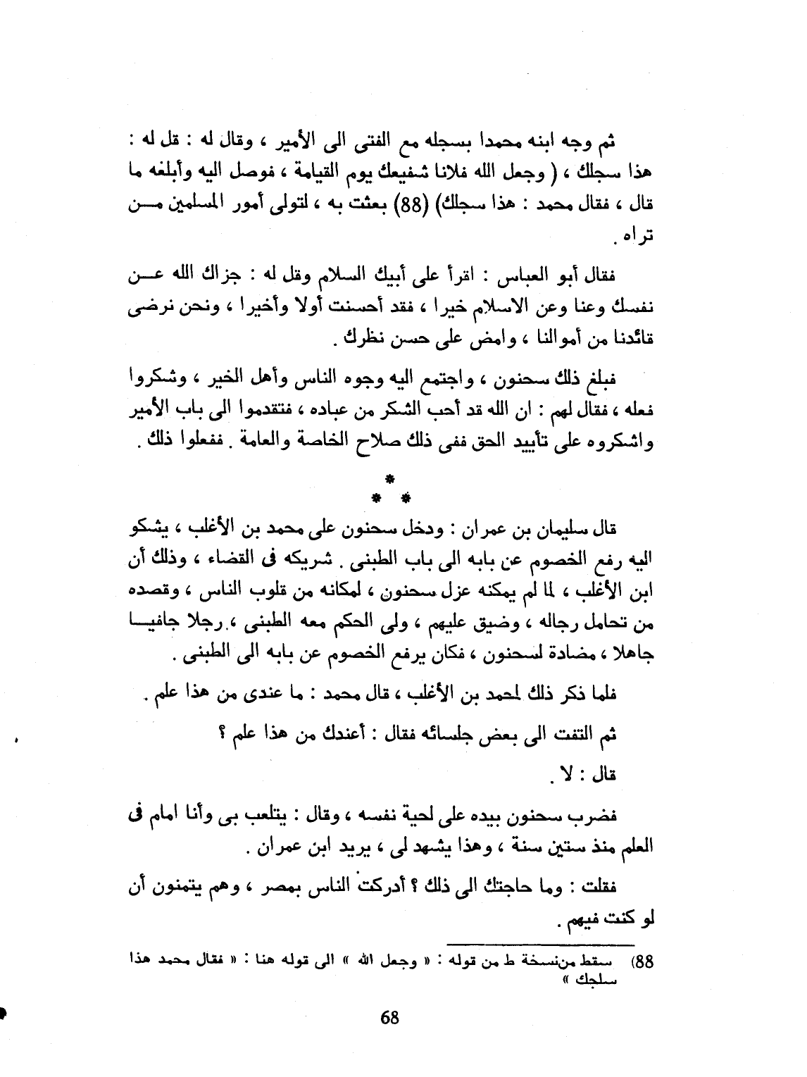 ثم وجه ابنه محمد بسجله مع الفتى إلى الأمير، وقال: قل له هذا سجلك، وجعل الله فلاناً شفيعك يوم القيامة. فوصلا إليه، وأبلغاه ما قال. فقال محمد: هذا سجلك بعث به لتولي أمور المسلمين من تراه. فقال أبو العباس: اقرأ على أبيك السلام، وقل له: جزاك الله عن نفسك وعنا وعن المسلمين خيراً. فقد أحسنت أولاً وآخراً. ونحن نرضي قائدنا من أموالنا. وامض على أحسن نظرك. فبلغ ذلك سحنون واجتمع إليه وجوه الناس وأهل الخير، وشكروا فعله. فقال لهم: إن الله قد أحب الشكر من عباده، فتقدموا إلى باب الأمير واشكروه على تأييد الحق، ففي ذلك صلاح الخاصة والعامة. ففعلوا ذلك. قال سليمان بن عمران: ودخل سحنون على محمد بن الأغلب يشكو إليه، رفع الخصوم عن بابه إلى باب الطبني شريكه في القضاء. وذلك، أن ابن الأغلب لما لم يمكنه عزل سحنون، لمكانه من قلوب الناس، وقصده من تحامل رجاله