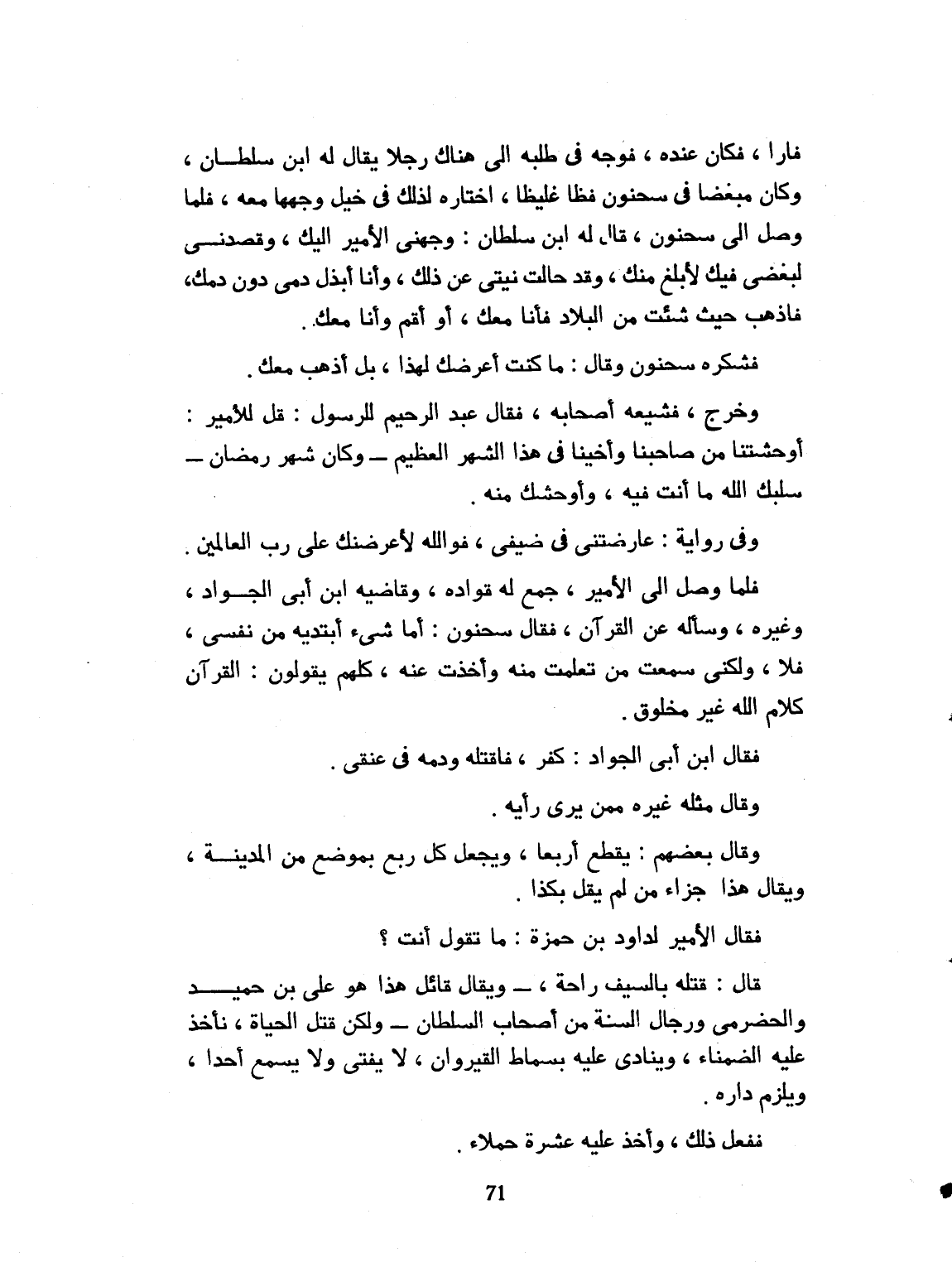 فاراً. فكان عنده. فوجه في طلبه إلى هناك رجل، يقال له، ابن سلطان، وكان مبغضاً في سحنون، فظاً غليظاً. أختاره في ذلك في خيل، وجهها معه. فلما وصل إلى سحنون، قال له ابن سلطان: وجهني الأمير إليك، وقصدني فيك لبغضي فيك، لأبلغ منك، وقد حالت بغيتي عن ذلك. وأنا ابذل دمي دون دمك، فاذهب حيث شئت من البلاد، أو أقم، فأنا معك. فشكره سحنون، وقال له: ما كنت أعرضك لهذا. بل اذهب معك، وخرج، فشيعه أصحابه. فقال عبد الرحيم للرسول: قل للأمير أوحشتنا من صاحبنا وأخينا في هذا الشهر العظيم. وكان شهر رمضان، سلبك الله أنت فيه وأوحشك منه، وفي رواية: عرضتني في ضيفي، فو الله لأعرضنك على رب العالمين. فلما وصل الأمير جمع له قواده، وقاضيه ابن أبي الجواد وغيره. وسأله عن القرآن، فقال سحنون: أما شيء أبديته في نفسي فلا. ولكني سمعت من تعلمت منهم، وأخذت عنهم، كلهم يقولون: القرآن كلام الله غير مخلوق. فقال ابن أبي الجواد: كفى فاقتله، ودمه في عنقي. وقال غيره: مثله. ممن يرى رأيه. وقال بعضهم: يقطع أرباعاً، ويجعل كل ربع بموضع في المدينة. ويقال ها جزاء من لم يقل بكذا. فقال الأمير لدواد بن حمزة: ما تقول أنت؟ قال: قتله بالسيف راحة. ويقال قائل هذا، علي بن حميد والحضرمي. ورجال أهل السنة من أصحاب السلطان، ولكن قتل الحياة. نأخذ عليه الضمناء، وينادي عليه بسماط القيروان: لا يفتي. ولا يسمع أحداً، ويلزم داره. ففعل ذلك. وأخذ عليه عشرة حملاء.