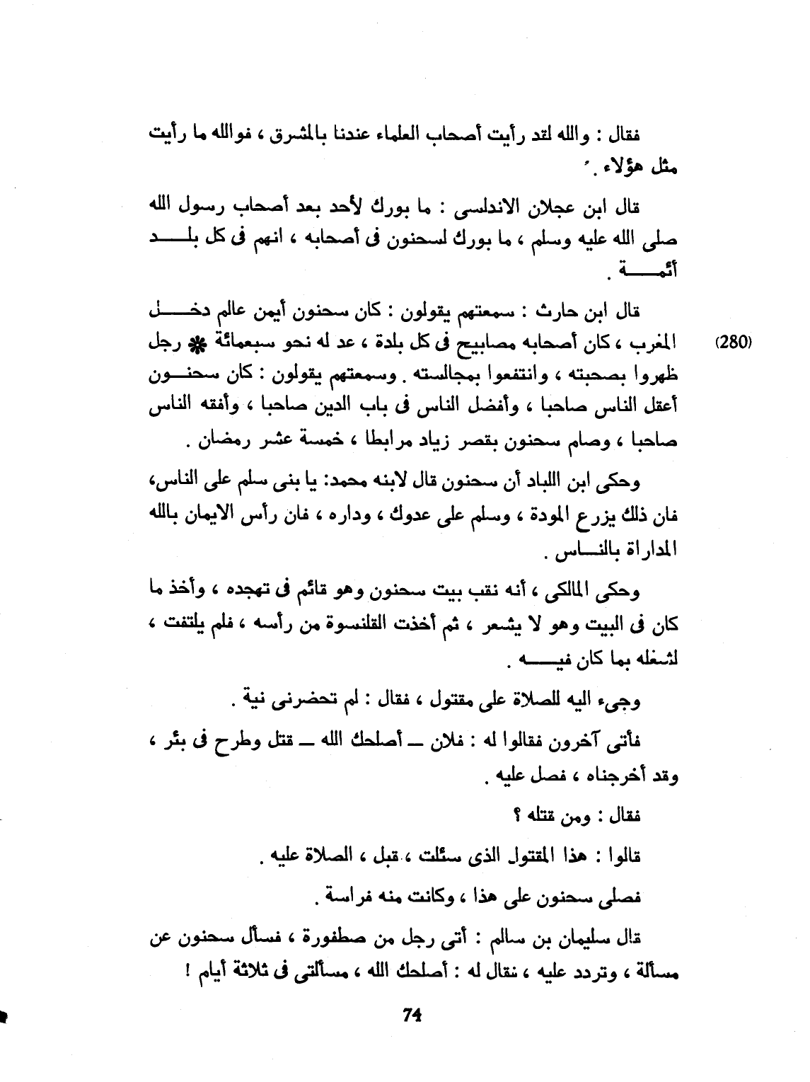 فقال: والله لقد رأيت العلماء عندنا بالمشرق، فوالله ما رأيت مثل هؤلاء. قال ابن عجلان الأندلسي: ما بورك لأحد بعد أصحاب رسول الله صلى الله عليه وسلم، ما بروك لسحنون في أصحابه، إنهم في كل بلد ائمة قال ابن حارث سمعتهم يقولون كان سحنون من أيمن العلماء؟ دخل المغرب، كأن أصحابه مصابيح، في كل بلدة، عدّ له نحو سبعمائة رجل، ظهروا بصحبته وانتفعوا بمجالسه، وسمعتهم يقولون: كان سحنون أعقل الناس صاحباً وأفضل الناس في باب الدين صاحباً، وأفقه الناس صاحباً. وقام سحنون بقصر زياد مرابطاً، خمسة عشر يوماً من رمضان. وحكى ابن اللباد، إن سحنون قال لأبنه محمد: يا بني، سلم على الناس، فإن ذلك يزرع المودة. وسلم على عدوك وداره، فإن رأس الإيمان بالله المداراة بالناس. وحكى المالكي أنه نقب بيت سحنون وهو قائم في تهجده، وأخذ ما كان في البيت، وهو لا يشعر، ثم أخذت القلنسوة من رأسه، فلم يلتفت لشغله بما كان فيه، وجيء إليه للصلاة على مقتول، فقال لم تحضرني نية. فأتى آخرون فقالوا له: فلان أصلحك الله، قتل وطرح في بئر، وقد أخرجناه، فصّل عليه. فقال: ومن قتله؟ قالوا: هذا المقتول الذي سئلت قبل الصلاة عليه. فصلى سحنون على هذا. وكانت منه فراسة. قال سليمان بن سالم: أتى رجل من صطفورة فسأل سحنون عن مسألة، وتردد عليه. فقال له: أصلحك الله مسألتي في ثلاثة أيام.