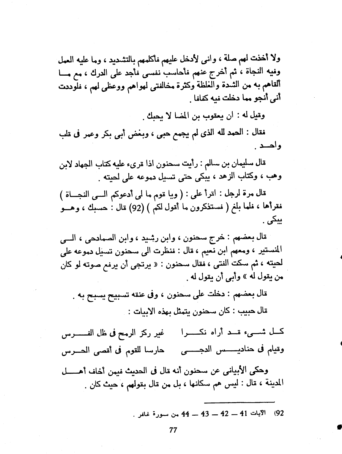 وما أخذت لهم صلة. وإني لأدخل عليه، فأكلمهم بالتشديد، وما عليه العمل وفيه النجاة. ثم أخرج عنهم، فأحاسب نفسي، فأجد عليّ الدرك مع ما ألقاهم به في الشدة والغلظة، وكثرة مخالفتي هواهم، ووعظي لهم. فوددت أن أنجو مما دخلت فيه كفافاً. وقيل له: إن يعقوب بن المضار لا يحبك فقال: الحمد لله، الذي لم يجمع حبي وبغض أبي بكر وعمر في قلب واحد قال سليمان بن سالم: رأيت سحنون إذا قرىء عليه الكتاب الجهاد لابن وهب. وكتاب الزهري، يبكي حتى تسيل دموعه على لحيته. وقال مرة لرجل: اقرأ علي: ويا قوم مالي أدعوكم إلى النجاة ... فقرأها. فلما بلغ: فستذكرون ما أقول لكم ... قال: حسبك. وهو يبكي. قال بعضهم: خرج سحنون وابن رشيد وابن الصمادحي إلى المنستير، ومعهم ابن نعيم، قال: نظرت إلى سحنون تسيل دموعه على لحيته. ثم سكت الفتى فقال سحنون: يرتجي أن يرتفع صوته، لو كان من يقول له، له. قال بعضهم: دخلت على سحنون وفي عنقه تسبيح يسبح به. قال حبيب: قال سحنون يتمثل بهذه الأبيات: