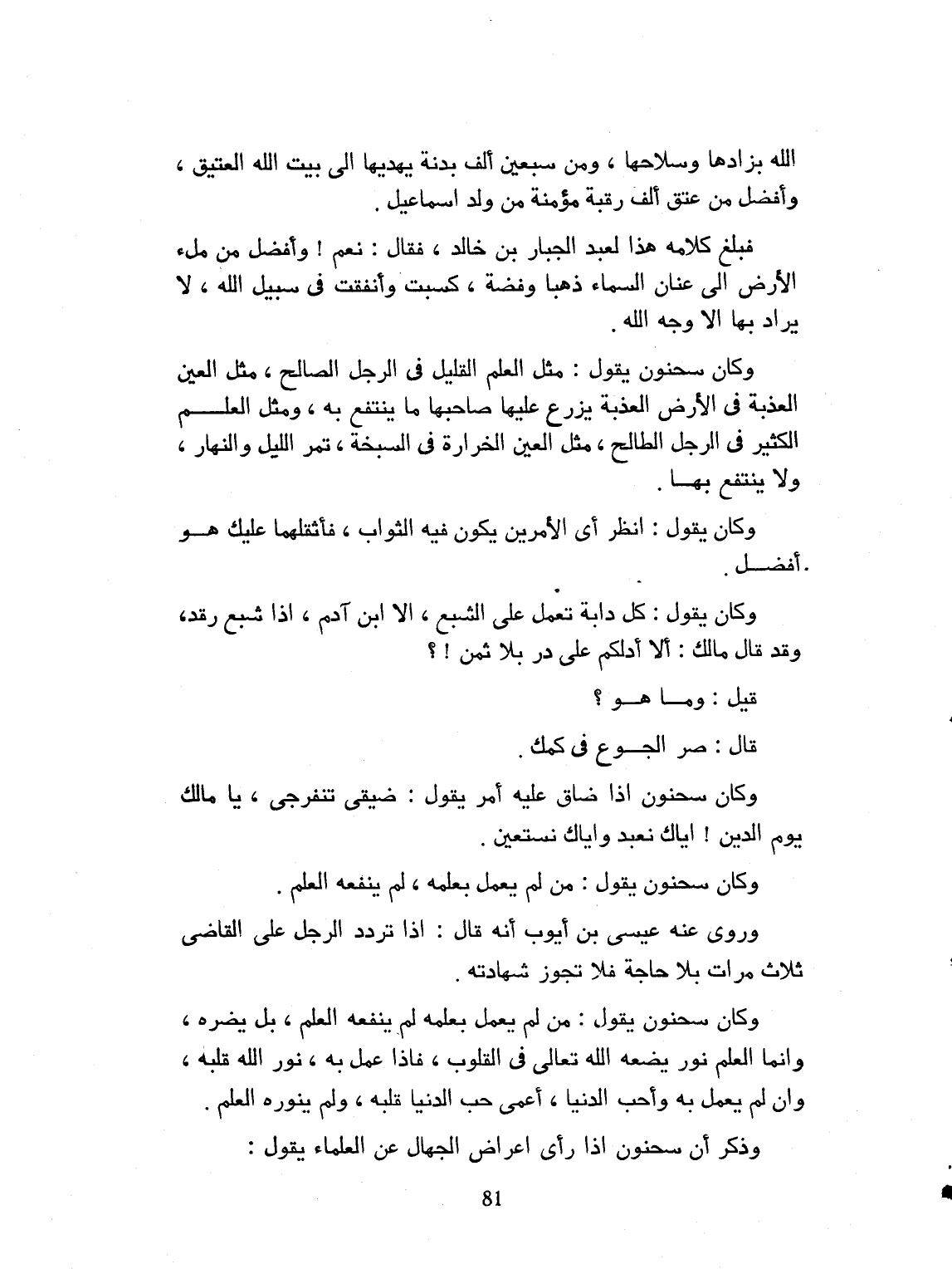 الله، بزادها وسلاحها. ومن سبعين ألف بدنة يهديها إلى بيت الله العتيق، وأفضل من عتق ألف رقبة مؤمنة من ولد إسماعيل. فبلغ كلامه هذا لعبد الجبار بن خالد، فقال: نعم. وأفضل من ملء الأرض إلى عنان السماء ذهباً أو فضة، كسبت وأنفقت في سبيل الله. لا يرد بها إلا وجه الله. وكان سحنون يقول: مثل العلم القليل، في الرجل الصالح، مثل العين العذبة في الأرض العذبة، يزرع عليها صاحبها ما ينتفع به. وكان يقول: انظر أبداً الأمرين، يكون فيها الثواب، فأثقلهما عليك، هو أفضل. وكان يقول: كلّ دابة، تعمل على الشبع إلا ابن آدم، إذا شبع رقد. وقد قال مالك: ألا أدلكم على درّ، بلا ثمن؟ قيل: وما هو؟ قال: هو صر الجوع في كمك. وكان سحنون إذا ضاق عليه أمر، يقول: ضيقي تنفرجي يا مالك يوم الدين، إياك نعبد وإياك نستعين. وكان سحنون يقول: من لم يعمل بعلمه، لم ينفعه العلم. وروى عنه عيسى ابن أيوب، أنه قال: إذ تردد على القاضي ثلاث مرارٍ بلا حاجة، فلا تجوز شهادته. وكان سحنون يقول: من لم يعمل بعلمه، لم ينفعه العلم، بل يضره. وإنما العلم نور يضعه الله تعالى في القلوب. فإذا عمل به نوّر الله قلبه. وإن لم يعمل به، وأحب الدنيا، أعمى حبٌّ الدنيا عليه. ولم ينوّره العلم، وكان سحنون إذا رأى إعراض الجهال عن العلماء يقول: