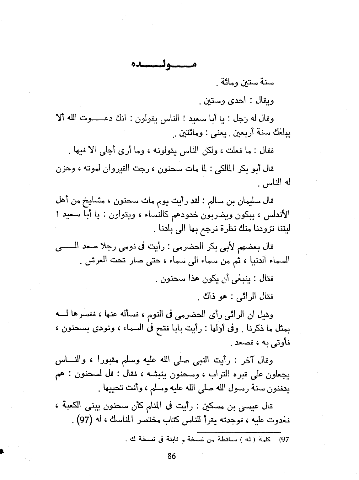 سنة ستين ومائة. ويقال إحدى وستين. وقال له رجل: يا أبا سعيد، الناس يقولون إنك دعوت الله أن لا يبلغك سنة أربعين ومائتين. فقال: ما فعلت، ولكن الناس يقولونه. وما أرى أجلي إلا فيها. قال أبو بكر المالكي: لما مات سحنون، رجتّ القيروان لموته، وحزن له الناس. قال سليمان بن سالم: لقد رأيت يوم مات سحنون، مشائخ من أهل الأندلس يبكون ويضربون خدودهم، كالنساء. يقولون يا أبا سعيد، ليتنا تزوّدنا منك نظرة، نرجع بها إلى بلدنا. قال بعضهم لأبي بكر الحضرمي: رأيت في نومي رجلاً صعد إلى سماء الدنيا، ثم من سماء إلى سماء، حتى صار تحت العرش. فقال ينبغي أن يكون هذا سحنون. فقال الرائي: هو ذاك. وقيل: إنّ الرائي رأى الحضرمي في النوم، فسأله عنها. ففسرها له بمثل ما ذكرنا. وفي أولها: رأيت باباً فُتح في السماء، ونودي بسحنون فأتي به، فصعد. وقال، آخر: رأيت النبي صلى الله عليه وسلم مقبوراً، والناس يجعلون على قبره التراب، وسحنون ينبشه. فقال: قل لسحنون هم يدفنون سنة رسول الله صلى الله عليه وسلم، وأنت تحييها. قال عيسى بن مسكين: رأينا في المنام كان سحنون يبني الكعبة، فغدوت عليه فوجدته يقرأ للناس كتاب مختصر المناسك، له.