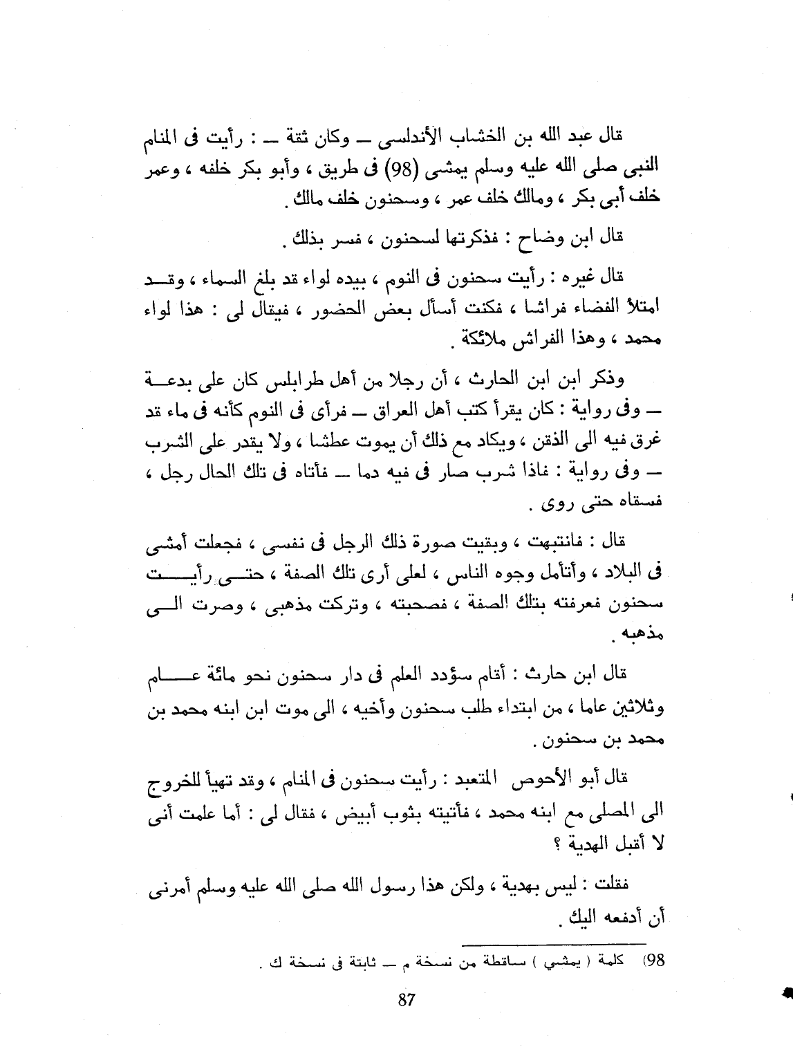 قال عبد الله بن الخشّاب الأندلسي، وكان ثقة: رأيت في المنام النبي صلى الله عليه وسلم، يمشي في طريق، وأبو بكر خلفه، وعمر خلف أبي بكر، ومالك خلف عمر، وسحنون خلف مالك، قال ابن وضاح: فذكرتها لسحنون فسر بذلك. وقال غيره: رأيت سحنون في النوم بيده لواء قد بلغ السماء وقد امتلأ الفضاء فراشاً، فكنت أسأل بعض الحضور، فيقال لي: هذا لواء محمد، وهذا الفراش ملائكة. وذكر ابن الحارث: إن رجلاً من أهل طرابلس، كان على بدعة، وفي رواية كان يقرأ كتب أهل العراق، فرأى في النوم كأنه في ماء قد غرق فيه إلى الذقن، ويكاد مع ذلك أن يموت عطشاً، ولا يقدر على الشرب. وفي رواية فإذا شرب صار فيه دماً. فأتاه في تلك الحال، رجل، فسقاه حتى روى. قال فانتبهت وبقيت صورة ذلك الرجل في نفسي، فجعلت أمشي في البلدان وأتأمل في وجوه الناس، لعلي أرى تلك الصفة، حتى رأيت سحنون فعرفته بتلك الصفة، فصحبته وتركت مذهبي، وصرت إلى مذهبه. قال ابن حارث: أقام سؤود العلم في دار سحنون، نحو مائة عام وثلاثين عاماً، من ابتداء طلب سحنون وأخيه، إلى موت ابن أبنه محمد بن محمد بن سحنون. قال أبو الأحوص المتعبد: رأيته في المنام وقد تهيأ للخروج إلى المصلى مع ابنه محمد، فأتيته بثوب أبيض، فقال لي: أما علمت أنا لا نقبل الهدية. فقلت: ليس بهدية، ولكن هذا رسول الله صلى الله عليه وسلم أمرني أن أدفعه إليك.