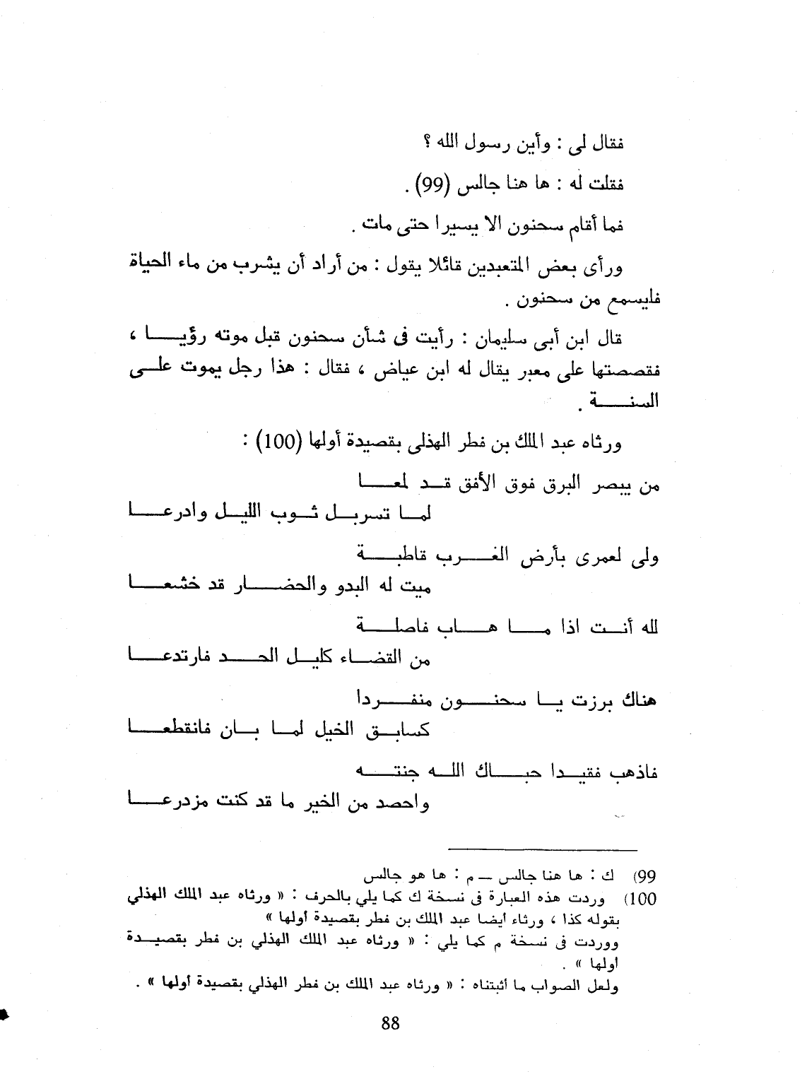 قال لي وأين رسول الله؟ فقلت له: ها هنا، حابس. فما قام سحنون إلا يسيراً، حتى مات. ورأى بعض المتعبدين قائلاً يقول: من أراد أن يشرب من ماء الحيوان فليسمع من سحنون. قال ابن أبي سليمان: رأيت في شأن سحنون، قبل موته، رؤيا فقصصتها على معبر يقال له ابن عياض، فقال: هذا رجل يموت على السنّة، ورثاه عبد الملك الهذلي بقوله كذا ورثاه أيضاً عبد الملك بن فطرن بقصيدة أولها: