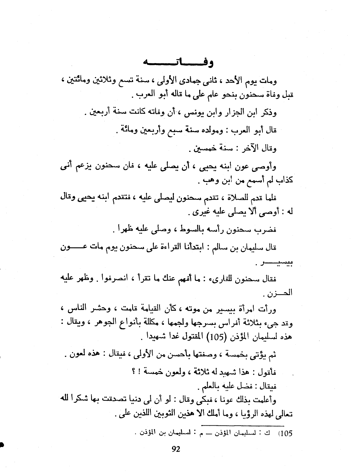 ومات يوم الأحد ثاني جمادى الأولى، سنة تسع وثلاثين ومائتين، قبل وفاة سحنون بنحو عام، على ما قاله العرب. وذكر ابن الجزار وابن يونس، أن وفاته كانت سنة أربعين، قال أبو العرب: ومولده سنة سبع وأربعين ومائة. وقال الآخر سنة خمسين. وأوصى عون ابنه يحيى أن يصلي عليه، فإن سحنون يزعم أني كذاب لم أسمع من ابن وهب. فلما قدم للصلاة، تقدم سحنون ليصلي عليه، فتقدم ابنه يحيى، وقال له أوصى أن لا يصلي عليه غيري، فضرب سحنون رأسه بالسوط وصلى عليه ظهراً. قال سليمان بن سالم: ابتدأنا القراءة على سحنون يوم مات عون بيسير. فقال سحنون للقارىء: ما أفهم عنك ما تقرأ انصرفوا. وظهر عليه الحزن، ورأت امرأة بيسير من موته كأن القيامة قامت، وحشر الناس، وقد جيء بثلاثة أفراس بسرجها ولجمها، مكللة بأنواع الجوهر. ويقال: هذه لسليمان المؤذن المقتول غدا، شهيداً. ثم يؤتى بخمسة وصفها بأحسن من الأولى، فيقال هذه لعون. فأقول: هذا شهيد له ثلاثة، ولعون خمسة، فيقال فضل عليه بالعلم. وأعلمت بذلك عوناً. فبكى وقال: لو أن لي دنيا، تصدقت بها شكراً لله تعالى، لهذه الرؤيا. وما أملك إلا هذين الثوبين اللذين علي.