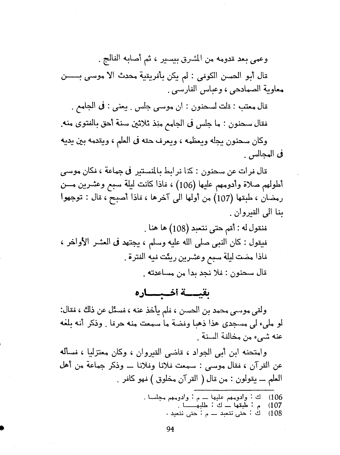 ثم أصابه الفالج. قال أبو الحسن الكوفي: لم يكن في إفريقية محدث، إلا موسى بن معاوية، وعباس الفارسي، قال مغيث: قلت لسحنون إن موسى جلس يفتي في الجامع، فقال: ما جلس في الجامع منذ ثلاثين سنة أحق بالفتوى منه. وكان سحنون يجله ويعظمه ويوفي حقه في العلم ويقدمه بين يديه في المجالس. قال: قرأت عن سحنون كنا برابطة المنستير في جماعة فكان موسى أطولهم صلاة وأدومهم عليها. فإذا كانت ليلة سبعة وعشرين من رمضان، طبقها من أولها الى آخرها. فإذا أصبح، قال: توجهوا بنا الى القيروان، فنقول له: أقم نتعبدها هنا. فيقول: كان النبي عليه السلام يجهد في العشر الأواخر، فإذا مضت ليلة سبعة وعشرين دبت فيه الفترة. قال سحنون: فلا نجد بداً من مساعدته. قال ابن أبي دليم: والأغلب عليه الحديث والرواية. وكان من أهل الورع والدين منابياً لأهل البدع. وذكره بعض، فقال: فيه بعض فقه مع كره الرواية. فقال هذا الصمادحي، عرضت له مسألة في حمار فما عرف ما يجب له حتى استفتى. قال فرات حضرة الأمير، زيادة الله. سئل الصمادحي، عن عمود في مسجد خرب، أراد تحويله الى الجامع. فقال: لا تحركه من موضعه يحتج له قال أبو الفضل ابن حميد: كنا نسمع من الصمادحي وقد كف فاستسقى فجئنا الى الماجل فإذا فيه ماء قليل، وفأر كبير، فأعلمناه. فقال: اروني منه نشمه، فلم يجد له رائحة. فقال: كيف ترون الماء؟ فقلت: صافياً. فشرب منه وشربنا، وتوضأ وتوضأنا. وتوفي ليوم الإثنين يقين من ذي القعدة سنة خمس، وقيل سنة ست وعشرين ومائتين، وسنّه خمس وستون سنة. قال ابن سحنون في تاريخه: ويقال أربع وستون. بعد أن أصابه ريح أبطله. فكان كالخشبة الملقاة. مولده فيما ذكر أبو العرب، مولد سحنون: بينهما ليلة. وقيل سنة. وكان موسى إذا رأى تقديم سحنون له، يقول: ما ترك علينا تلك الليلة. يريد أن بسببها. كان يجله سحنون، وأما أبوه معاوية، فله سماع من الثوري وابن أنعم، وحنظلة بن أبي سفيان. وكان معدوداً في شيوخ إفريقية. روى عنه ابنه وسحنون وأبو داود العطار، وكان ثقة ورمي برأي الصفرية، ولعله لا يصح عنه. توفي معاوية والد موسى سنة تسع وتسعين ومائة.