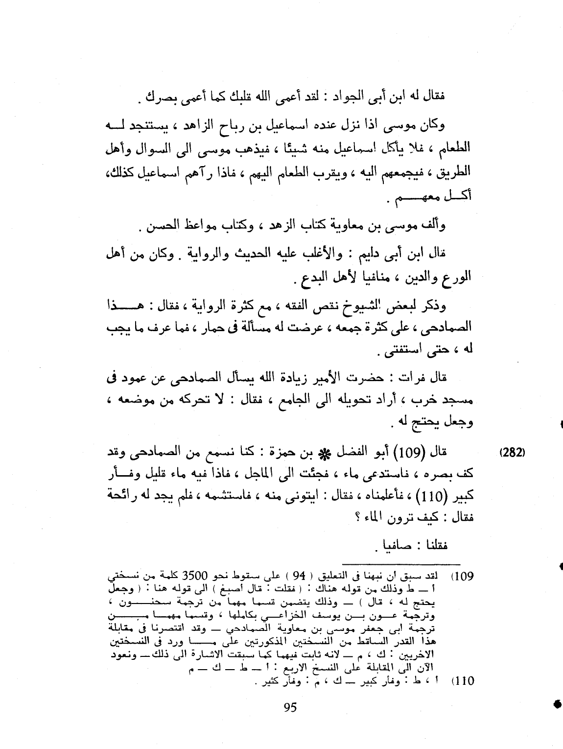 فقال له ابن أبي الجواد: لقد أعمى الله قلبك، كما أعمى بصرك. وكان موسى إذ ذاك قد كفّ بصره. وكان موسى إذا نزل عنده اسماعيل بن رباح الزاهد يستجد له الطعام، فلا يأكل منه إسماعيل شيئاً. فيذهب موسى الى السؤال وأهل الطرق، فإذا رآهم إسماعيل كذلك وقرب إليهم موسى الطعام دنا إسماعيل، فأكل معهم، وألف موسى بن معاوية كتاب الزهد، وكتاب مواعظ الحسن