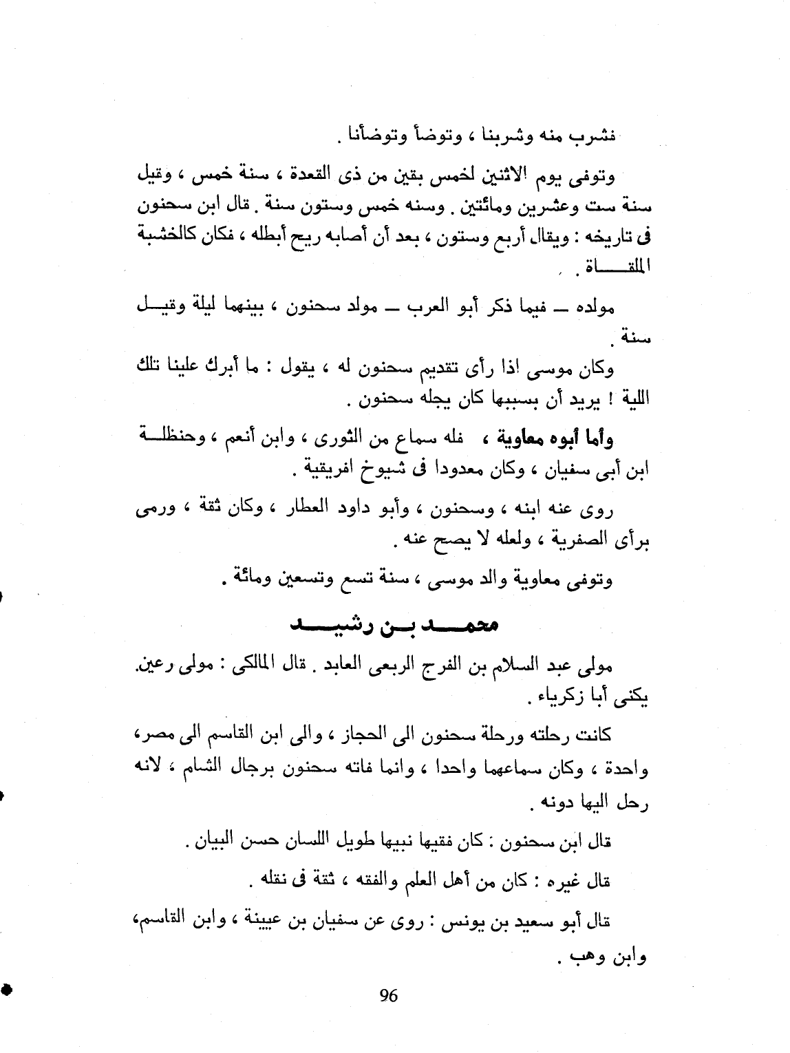 محمد بن رشيد مولى عبد السلام بن مفرج الربعي القائد. وقال المالكي: مولى عمر. كانت رحلته ورحلة سحنون الى الحجاز، والى ابن القاسم واحدة. وكان سماعهما واحداً. وإنما نابه سحنون برجال الشام. لأنه رحل الى الشام دونه. قال سحنون: كان فقيهاً فهماً طويل اللسان، حسن البيان، قال غيره: كان من أهل العلم والفقه، ثقة في نقله. قال أبو سعيد يونس: روى عن سفيان بن عيينة وابن القاسم، وابن وهب.