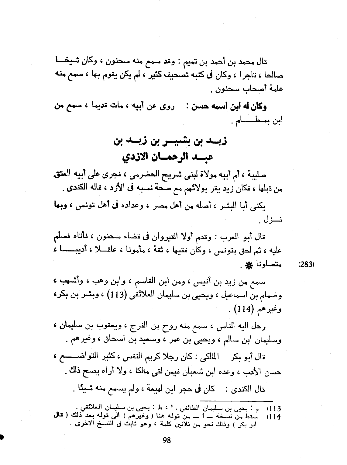 صليد أم ابنه، مولده لبني سريح الحضرمي، يجري على أبيه العتق من قبلها. فكان زيد يقر بولائهم، مع صحة نسبه في الأزد. قال الكندي: هذا، ويكنى أبا البشر. أصله من أهل مصر، وعداده في أهل تونس، وبها نزل. قال أبو العرب: وقدم أولاً القيروان، في قضاء سحنون. فأتاه فسلم عليه، ثم لحق بتونس. وكان فقيهاً ثقة مأموناً أديباً مصوناً. سمع زيد بن بشر، من ابن القاسم ومن وهب وأشهب وضمام بن إسماعيل، ويحيى بن سليمان الطائفي، وبشر بن بكر وغيرهم. قال أبو بكر المالكي: كان رجلاً كريم النفس، كثير التواضع، حسن الأدب، وعدّه ابن سفيان فيمن لقي مالكاً. ولا أراه يصح ذلك. قال الكندي: كان في حجر ابن لهيعة، ولم يسمع منه شيئاً.