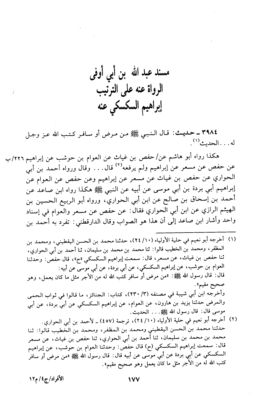 هَكَذَا رَوَاهُ أَبُو هَاشم عَن 226 / ب حَفْص بن غياث عَن الْعَوام بن حَوْشَب عَن إِبْرَاهِيم عَن حَفْص عَن مسعر عَن إِبْرَاهِيم وَلم يرفعهُ قَالَ ... وَقَالَ وَرَوَاهُ أَحْمد بن أبي الْحوَاري عَن حَفْص بن غياث عَن مسعر عَن إِبْرَاهِيم وَعَن حَفْص عَن الْعَوام عَن إِبْرَاهِيم أبي بردة بن أبي مُوسَى عَن أَبِيه عَن النَّبِي هَكَذَا رَوَاهُ ابْن صاعد عَن أَحْمد بن إِسْحَاق بن صَالح عَن ابْن أبي الْحوَاري، وَرَوَاهُ أَبُو الرّبيع الْحُسَيْن بن الْهَيْثَم الرَّازِيّ عَن ابْن أبي الْحوَاري فَقَالَ: عَن حَفْص عَن مسعر والعوام فِي إِسْنَاد وَاحِد وَأَشَارَ ابْن صاعد إِلَى أَن هَذَا هُوَ الصَّوَاب وَقَالَ الدَّارَقُطْنِيّ: تفرد بِهِ أَحْمد بن