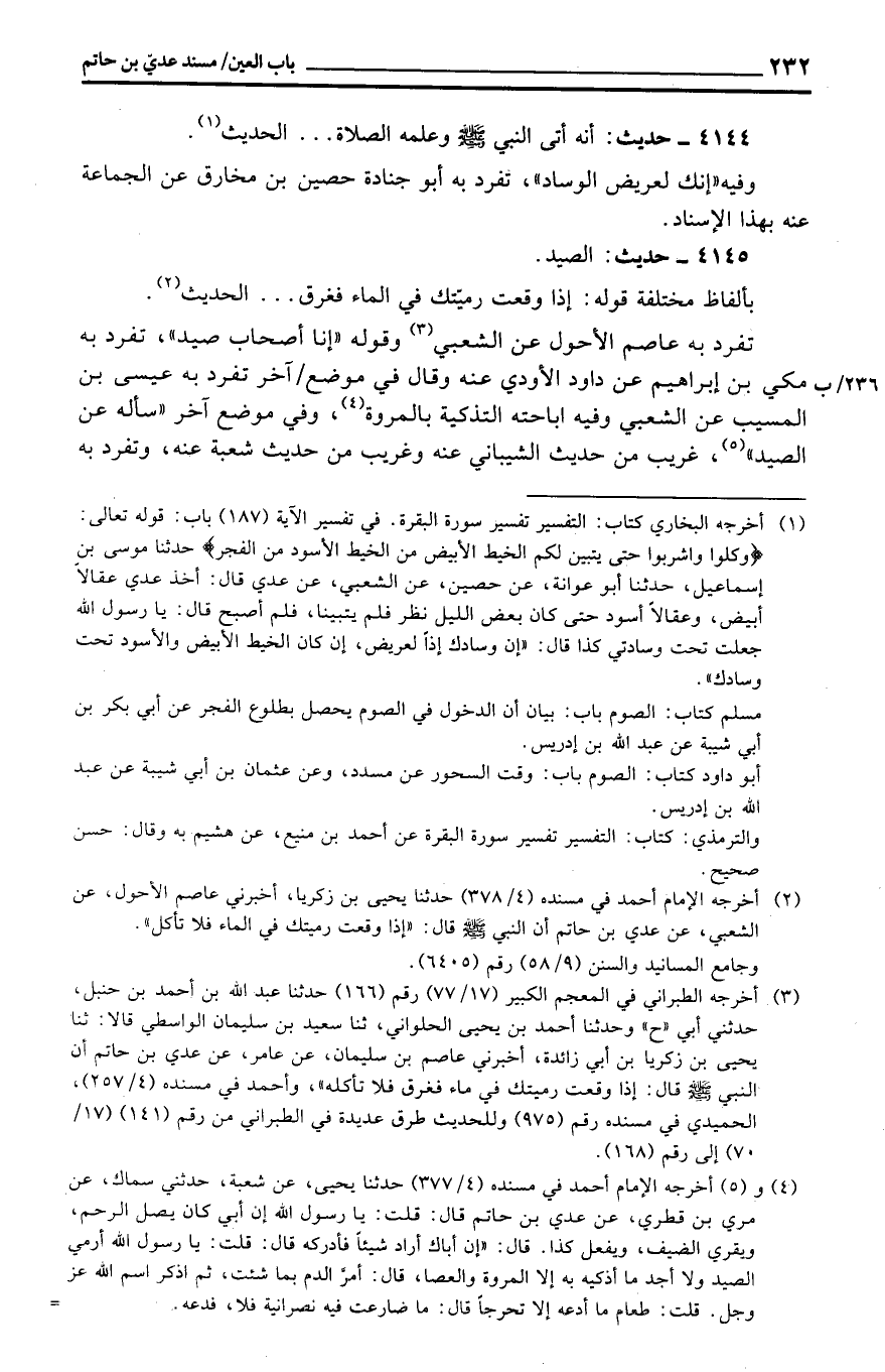 تفرد بِهِ عَاصِم الْأَحول عَن الشّعبِيّ وَقَوله " إِنَّا أَصْحَاب صيد " تفرد بِهِ مكي بن إِبْرَاهِيم عَن دَاوُد الأودي عَنهُ وَقَالَ فِي مَوضِع / آخر تفرد بِهِ عِيسَى بن الْمسيب عَن الشّعبِيّ وَفِيه إِبَاحَته التذكية بالمروة، وَفِي مَوضِع آخر " سَأَلَهُ عَن الصَّيْد "، غَرِيب من حَدِيث الشَّيْبَانِيّ عَنهُ وغريب من حَدِيث شُعْبَة عَنهُ، وَتفرد بِهِ