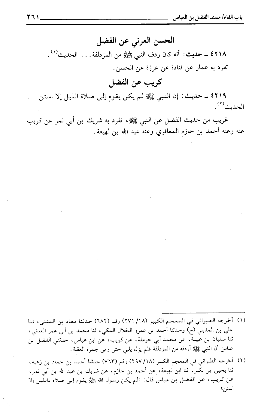 غَرِيب من حَدِيث الْفضل عَن النَّبِي، تفرد بِهِ شريك بن أبي نمر عَن كريب عَنهُ وَعنهُ أَحْمد بن حَازِم الْمعَافِرِي وَعنهُ عبد الله بن لَهِيعَة.