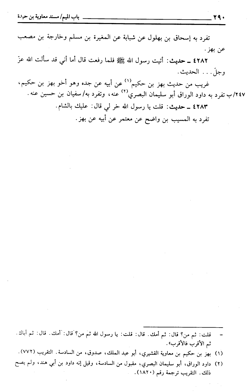 غَرِيب من حَدِيث بهز بن حَكِيم عَن أَبِيه عَن جده وَهُوَ أَخُو بهز بن حَكِيم، تفرد بِهِ دَاوُد الْوراق أَبُو سُلَيْمَان الْبَصْرِيّ عَنهُ، وَتفرد بِهِ / سُفْيَان بن حُسَيْن عَنهُ.