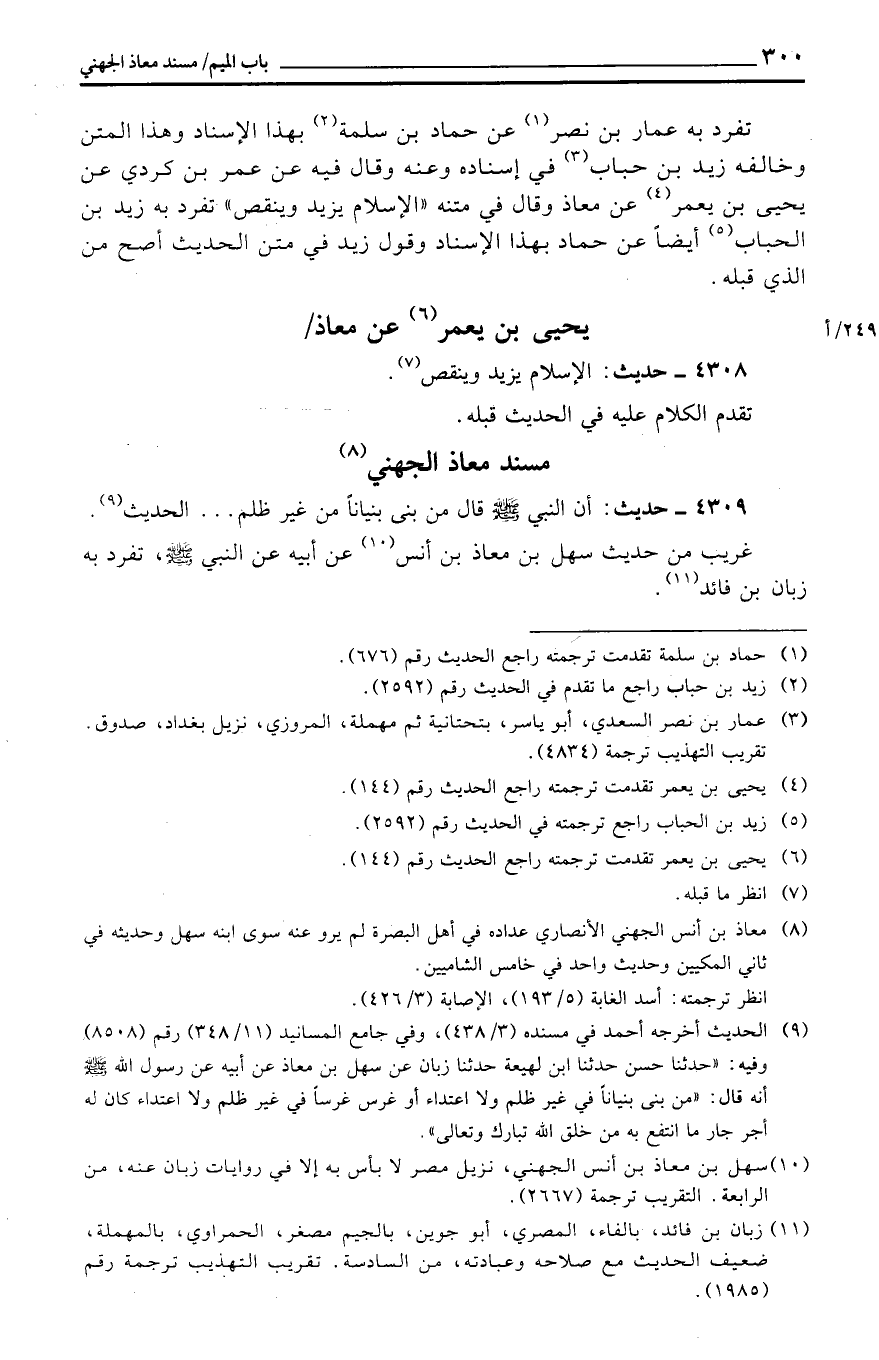 تفرد بِهِ عمار بن نصر عَن حَمَّاد بن سَلمَة بِهَذَا الْإِسْنَاد وَهَذَا الْمَتْن وَخَالفهُ زيد بن حباب فِي إِسْنَاده وَعنهُ وَقَالَ فِيهِ عَن عمر بن كردِي عَن يحيى بن يعمر عَن معَاذ وَقَالَ فِي مَتنه " الْإِسْلَام يزِيد وَينْقص " تفرد بِهِ زيد بن الْحباب أَيْضا عَن حَمَّاد بِهَذَا الْإِسْنَاد وَقَول زيد فِي متن الحَدِيث أصح من الَّذِي قبله.