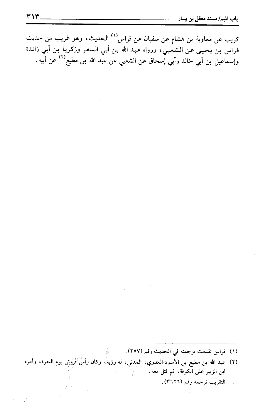 كريب عَن مُعَاوِيَة بن هِشَام عَن سُفْيَان عَن فراس الحَدِيث، وَهُوَ غَرِيب من حَدِيث فراس بن يحيى عَن الشّعبِيّ، وَرَوَاهُ عبد الله بن أَي السّفر وزَكَرِيا بن أبي زَائِدَة وَإِسْمَاعِيل بن أبي خَالِد وَأبي إِسْحَاق عَن الشّعبِيّ عَن عبد الله بن مُطِيع عَن أَبِيه.