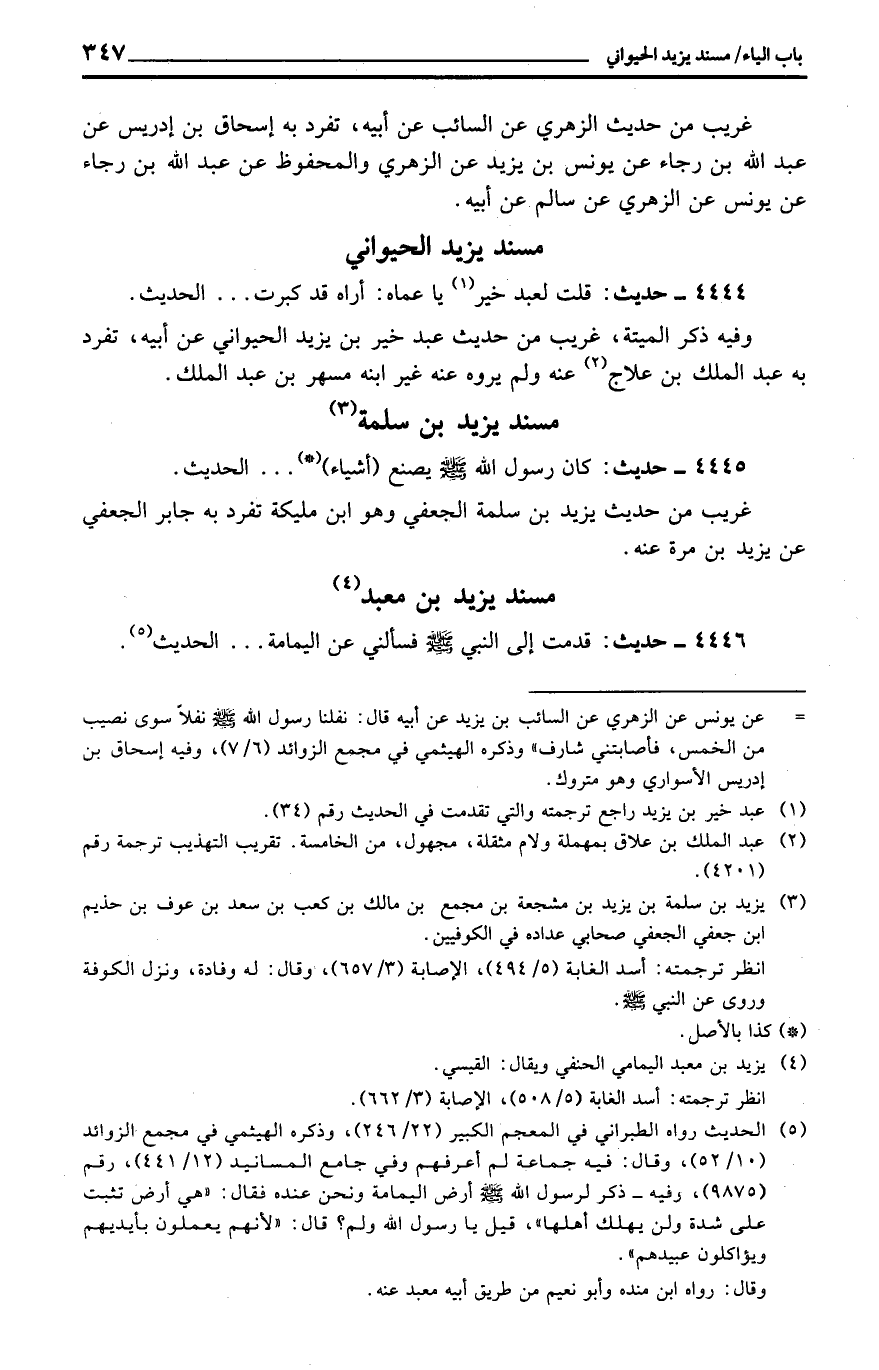 وَفِيه ذكر الْميتَة، غَرِيب من حَدِيث عبد خير بن يزِيد الحيواني عَن أَبِيه، تفرد بِهِ عبد الْملك بن علاج عَنهُ وَلم يروه عَنهُ غير ابْنه مسْهر بن عبد الْملك.