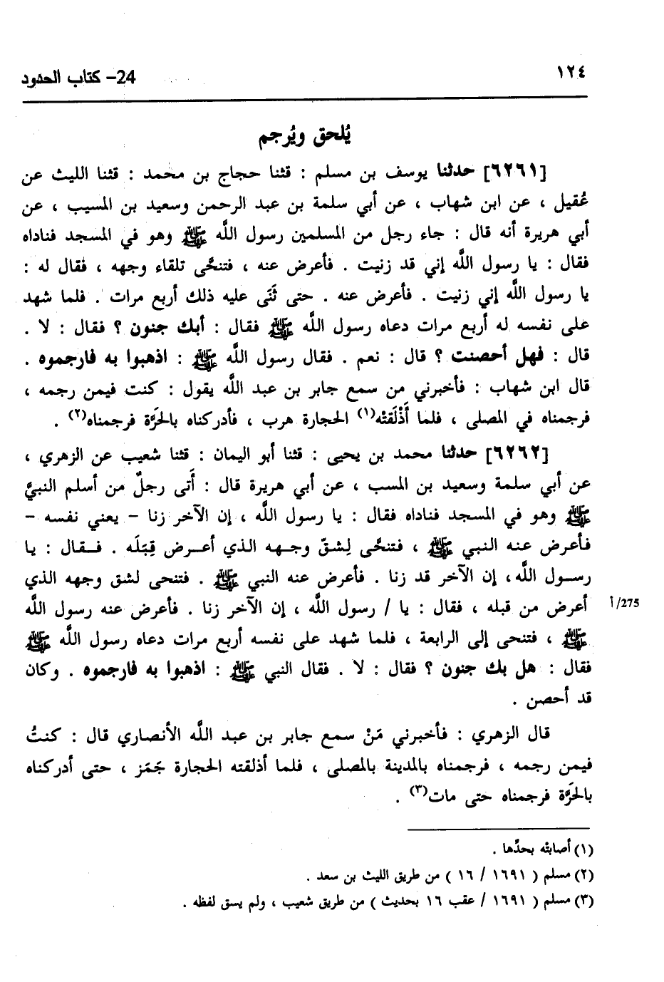 6261 - حَدَّثَنَا يُوسُفُ بْنُ مُسْلِمٍ، قثنا حَجَّاجُ بْنُ مُحَمَّدٍ، قثنا اللَّيْثُ، عَنْ عَقِيلٍ، عَنِ ابْنِ شِهَابٍ، عَنْ أَبِي سَلَمَةَ بْنِ عَبْدِ الرَّحْمَنِ، وَسَعِيدِ بْنِ الْمُسَيِّبِ، عَنْ أَبِي هُرَيْرَةَ، أَنَّهُ قَالَ: §جَاءَ رَجُلٌ مِنَ الْمُسْلِمِينَ رَسُولَ اللَّهِ صَلَّى اللهُ عَلَيْهِ وَسَلَّمَ وَهُوَ فِي الْمَسْجِدِ فَنَادَاهُ، فَقَالَ: يَا رَسُولَ اللَّهِ إِنِّي قَدْ زَنَيْتُ فَأَعْرَضَ عَنْهُ فَتَنَحَّى تِلْقَاءَ وَجْهِهِ فَقَالَ لَهُ: يَا رَسُولَ اللَّهِ إِنِّي زَنَيْتُ فَأَعْرَضَ عَنْهُ حَتَّى ثَنَّى عَلَيْهِ ذَلِكَ أَرْبَعَ مَرَّاتٍ، فَلَمَّا شَهِدَ عَلَى نَفْسِهِ لَهُ أَرْبَعَ مَرَّاتٍ دَعَاهُ رَسُولُ اللَّهِ صَلَّى اللهُ عَلَيْهِ وَسَلَّمَ، فَقَالَ: «أَبِكَ جُنُونٌ؟» ، فَقَالَ: لَا، قَالَ: «فَهَلْ أَحْصَنْتَ؟» ، قَالَ: نَعَمْ، فَقَالَ رَسُولُ اللَّهِ صَلَّى اللهُ عَلَيْهِ وَسَلَّمَ: «اذْهَبُوا بِهِ فَارْجُمُوهُ» ، قَالَ ابْنُ شِهَابٍ: فَأَخْبَرَنِي مَنْ سَمِعَ جَابِرَ بْنَ عَبْدِ اللَّهِ يَقُولُ: كُنْتُ فِيمَنْ رَجَمَهُ فَرَجَمْنَاهُ فِي الْمُصَلَّى فَلَمَّا أَذْلَقَتْهُ الْحِجَارَةُ هَرَبَ فَأَدْرَكْنَاهُ بِالْحَرَّةِ فَرَجَمْنَاهُ