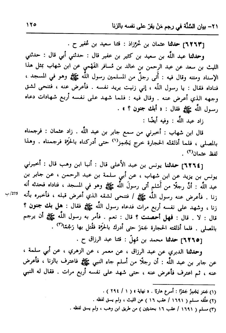 6263 - حَدَّثَنَا عُثْمَانُ بْنُ خُرَّزَاذَ، قثنا سَعِيدُ بْنُ عُفَيْرٍ، ح وَحَدَّثَنَا عَبْدُ اللَّهِ بْنُ سَعِيدِ بْنِ كَثِيرِ بْنِ عُفَيْرٍ، قَالَ: حَدَّثَنِي أَبِي قَالَ: حَدَّثَنِي اللَّيْثُ بْنُ سَعْدٍ، عَنْ عَبْدِ الرَّحْمَنِ بْنِ خَالِدِ بْنِ مُسَافِرٍ الْفَهْمِيِّ، عَنِ ابْنِ شِهَابٍ، بِمِثْلِ هَذَا الْإِسْنَادِ وَمَتْنِهِ، وَقَالَ فِيهِ: §أَتَى رَجُلٌ مِنَ الْمُسْلِمِينَ رَسُولَ اللَّهِ صَلَّى اللهُ عَلَيْهِ وَسَلَّمَ، وَهُوَ فِي الْمَسْجِدِ فَنَادَاهُ، فَقَالَ: يَا رَسُولَ اللَّهِ إِنِّي زَنَيْتُ يُرِيدُ نَفْسَهُ فَأَعْرَضَ عَنْهُ فَتَنَحَّى لِشِقِّ وَجْهِهِ الَّذِي أَعْرَضَ عَنْهُ، وَقَالَ فِيهِ: فَلَمَّا شَهِدَ عَلَى نَفْسِهِ أَرْبَعَ شَهَادَاتٍ دَعَاهُ رَسُولُ اللَّهِ صَلَّى اللهُ عَلَيْهِ وَسَلَّمَ، فَقَالَ: «أَبِكَ جُنُونٌ؟» ، زَادَ عَبْدُ اللَّهِ وَفِيهِ أَيْضًا، قَالَ ابْنُ شِهَابٍ: أَخْبَرَنِي مَنْ سَمِعَ جَابِرَ بْنَ عَبْدِ اللَّهِ، زَادَ عُثْمَانُ: فَرَجَمْنَاهُ بِالْمُصَلَّى فَلَمَّا أَذْلَقَتْهُ الْحِجَارَةُ خَرَجَ يَجْمِزُ حَتَّى أَدْرَكْنَاهُ بِالْحَرَّةِ فَرَجَمْنَاهُ، وَهَذَا لَفْظُ عُثْمَانَ