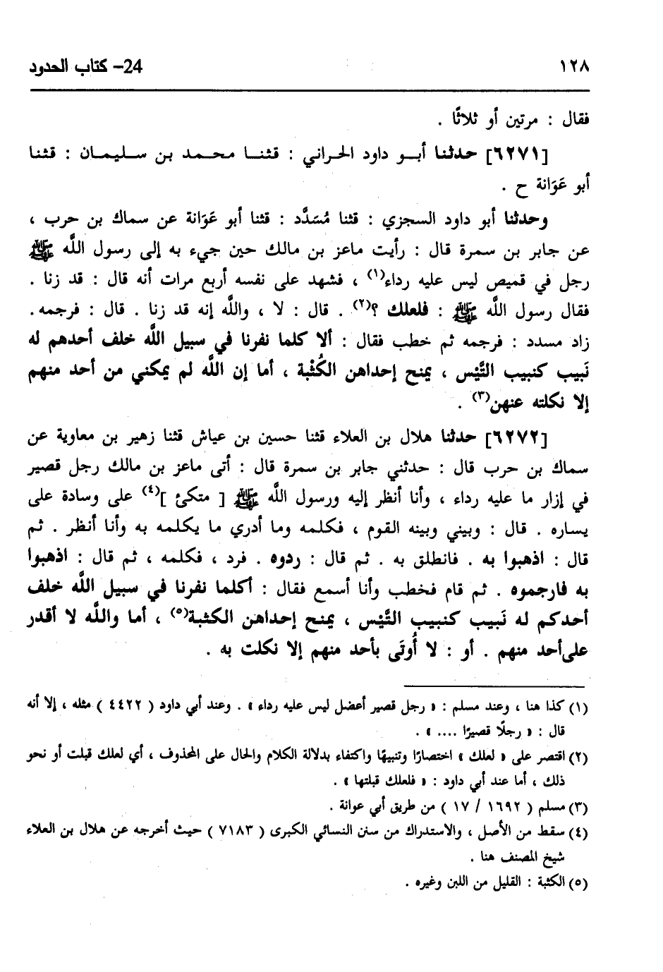 6271 - حَدَّثَنَا أَبُو دَاوُدَ الْحَرَّانِيُّ، قثنا مُحَمَّدُ بْنُ سُلَيْمَانَ، قثنا أَبُو عَوَانَةَ، ح وَحَدَّثَنَا أَبُو دَاوُدَ السِّجْزِيُّ، قثنا مُسَدَّدٌ، قثنا أَبُو عَوَانَةَ، عَنْ سِمَاكِ بْنِ حَرْبٍ، عَنْ جَابِرِ بْنِ سَمُرَةَ، قَالَ: رَأَيْتُ §مَاعِزَ بْنَ مَالِكٍ حِينَ جِئَ بِهِ إِلَى رَسُولِ اللَّهِ صَلَّى اللهُ عَلَيْهِ وَسَلَّمَ رَجُلٌ فِي قَمِيصٍ لَيْسَ عَلَيْهِ رِدَاءٌ، فَشَهِدَ عَلَى نَفْسِهِ أَرْبَعَ مَرَّاتٍ أَنَّهُ، قَالَ: قَدْ زَنَا، فَقَالَ رَسُولُ اللَّهِ صَلَّى اللهُ عَلَيْهِ وَسَلَّمَ: «فَلَعَلَّكَ» ؟، قَالَ: لَا وَاللَّهِ إِنَّهُ قَدْ زَنَا، قَالَ: فَرَجَمَهُ، زَادَ مُسَدَّدٌ فَرَجَمَهُ ثُمَّ خَطَبَ، فَقَالَ: «أَلَا كُلَّمَا نَفَرْنَا فِي سَبِيلِ اللَّهِ خَلَفَ أَحَدُهُمْ لَهُ نَبِيبٌ كَنَبِيبِ التَّيْسِ يَمْنَحُ إِحْدَاهُنَّ الْكُثْبَةَ، أَمَا إِنَّ اللَّهَ لَمْ يُمْكِنِّي مِنْ أَحَدٍ مِنْهُمْ إِلَّا نَكَّلْتُهُ عَنْهُنَّ»