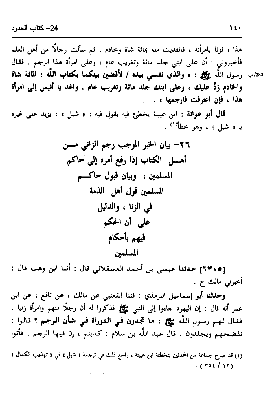 6305 - حَدَّثَنَا عِيسَى بْنُ أَحْمَدَ الْعَسْقَلَانِيُّ، قَالَ: أنبا ابْنُ وَهْبٍ، قَالَ: أَخْبَرَنِي مَالِكٌ، ح وَحَدَّثَنَا أَبُو إِسْمَاعِيلَ التِّرْمِذِيُّ، قثنا الْقَعْنَبِيُّ، عَنْ مَالِكٍ، عَنْ نَافِعٍ، عَنِ ابْنِ عُمَرَ، أَنَّهُ قَالَ: إِنَّ §الْيَهُودَ جَاءُوا إِلَى النَّبِيِّ صَلَّى اللهُ عَلَيْهِ وَسَلَّمَ فَذَكَرُوا لَهُ أَنَّ رَجُلًا مِنْهُمْ وَامْرَأَةً زَنَيَا، فَقَالَ لَهُمْ رَسُولُ اللَّهِ صَلَّى اللهُ عَلَيْهِ وَسَلَّمَ: «مَا تَجِدُونَ فِي التَّوْرَاةِ فِي شَأْنِ الرَّجْمِ؟» ، قَالُوا: نَفْضَحُهُمْ وَيُجْلَدُونَ، قَالَ عَبْدُ اللَّهِ بْنُ سَلَّامٍ: كَذَبْتُمْ إِنَّ فِيهَا الرَّجْمَ، فَأَتَوْا -[141]- بِالتَّوْرَاةِ، وَنَشَرَهَا فَوَضَعَ أَحَدُهُمْ يَدَهُ عَلَى آيَةِ الرَّجْمِ، فَقَرَأَ مَا قَبْلَهَا وَمَا بَعْدَهَا، فَقَالَ لَهُ عَبْدُ اللَّهِ بْنُ سَلَّامٍ: ارْفَعْ يَدَكَ فَرَفَعَ يَدَهُ فَإِذَا فِيهَا آيَةُ الرَّجْمِ، قَالُوا: صَدَقَ مُحَمَّدٌ فِيهَا آيَةُ الرَّجْمِ، فَأَمَرَ بِهِمَا رَسُولُ اللَّهِ صَلَّى اللهُ عَلَيْهِ وَسَلَّمَ فَرُجِمَا، قَالَ ابْنُ عُمَرَ: فَرَأَيْتُ الرَّجُلَ يَحْنِي عَلَى الْمَرْأَةِ، يَقِيهَا الْحِجَارَةَ