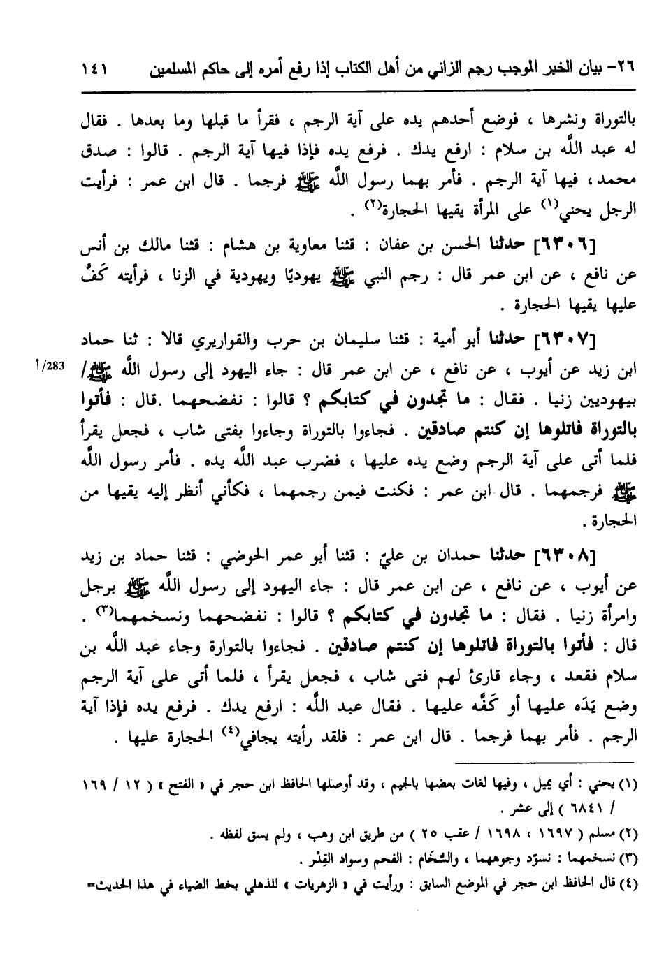 6308 - حَدَّثَنَا حَمْدَانُ بْنُ عَلِيٍّ، قثنا أَبُو عُمَرَ الْحَوْضِيُّ، قثنا حَمَّادُ بْنُ زَيْدٍ، عَنْ أَيُّوبَ، عَنْ نَافِعٍ، عَنِ ابْنِ عُمَرَ، قَالَ: §جَاءَ الْيَهُودُ إِلَى رَسُولِ اللَّهِ صَلَّى اللهُ عَلَيْهِ وَسَلَّمَ بِرَجُلٍ وَامْرَأَةٍ زَنَيَا، فَقَالَ: «مَا تَجِدُونَ فِي كِتَابِكُمْ؟» ، قَالُوا: نَفْضَحُهُمَا ونُسَخِّمُهُمَا، قَالَ: «فَأْتُوا بِالتَّوْرَاةِ فَاتْلُوهَا إِنْ كُنْتُمْ صَادِقِينَ» ، فَجَاءُوا بِالتَّوْرَاةِ، وَجَاءَ عَبْدُ اللَّهِ بْنُ سَلَّامٍ فَقَعَدَ، وَجَاءَ قَارِئٌ لَهُمْ فَتًى شَابٌّ فَجَعَلَ يَقْرَأُ فَلَمَّا أَتَى عَلَى آيَةِ الرَّجْمِ وَضَعَ يَدَهُ عَلَيْهَا أَوْ كَفَّهُ عَلَيْهَا، فَقَالَ عَبْدُ اللَّهِ: ارْفَعْ يَدَكَ فَرَفَعَ يَدَهُ فَإِذَا آيَةُ الرَّجْمِ فَأَمَرَ بِهِمَا فَرُجِمَا، قَالَ ابْنُ عُمَرَ: فَلَقَدْ رَأَيْتُهُ يُجَافِي الْحِجَارَةَ عَلَيْهَا