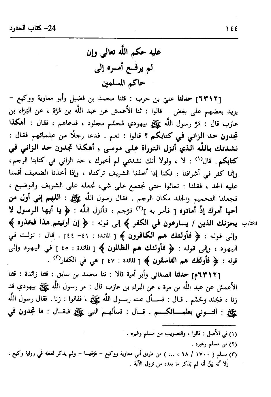 6312 - حَدَّثَنَا عَلِيُّ بْنُ حَرْبٍ، قثنا مُحَمَّدُ بْنُ فُضَيْلٍ، وَأَبُو مُعَاوِيَةَ، وَوَكِيعٌ، يَزِيدُ بَعْضُهُمْ عَلَى بَعْضٍ، قَالُوا: ثَنَا الْأَعْمَشُ، عَنْ عَبْدِ اللَّهِ بْنِ مُرَّةَ، عَنِ الْبَرَاءِ بْنِ عَازِبٍ، قَالَ: §مَرَّ رَسُولُ اللَّهِ صَلَّى اللهُ عَلَيْهِ وَسَلَّمَ بِيَهُودِيٍّ مُحَمَّمٍ مَجْلُودٍ فَدَعَاهُمْ، فَقَالَ: «أَهَكَذَا تَجِدُونَ حَدَّ الزَّانِي فِي كِتَابِكُمْ» ، قَالُوا: نَعَمْ، فَدَعَا رَجُلًا مِنْ عُلَمَائِهِمْ، فَقَالَ: «نَشَدْتُكَ بِاللَّهِ الَّذِي أَنْزَلَ التَّوْرَاةَ عَلَى مُوسَى أَهَكَذَا تَجِدُونَ حَدَّ الزَّانِي فِي كِتَابِكُمْ؟» ، قَالَ: لَا وَلَوْلَا أَنَّكَ نَشَدْتَنِي لَمْ أُخْبِرُكَ، حَدُّ الزَّانِي فِي كِتَابِنَا الرَّجْمُ، وَإِنَّمَا كَثُرَ فِي أَشْرَافِنَا فَكُنَّا إِذَا أَخَذْنَا الشَّرِيفَ تَرَكْنَاهُ وَإِذَا أَخَذْنَا الضَّعِيفَ أَقَمْنَا عَلَيْهِ الْحَدَّ، فَقُلْنَا: تَعَالَوْا حَتَّى نَجْتَمِعَ عَلَى شَيْءٍ نَجْعَلُهُ عَلَى الشَّرِيفِ وَالْوَضِيعِ، فَجَعَلْنَا التَّحْمِيمَ وَالْجَلْدَ مَكَانَ الرَّجْمِ، فَقَالَ رَسُولُ اللَّهِ صَلَّى اللهُ عَلَيْهِ وَسَلَّمَ: «اللَّهُمَّ إِنِّي أَوَّلُ مَنْ أَحْيَا أَمْرَكَ إِذْ أَمَاتُوهُ» ، فَأَمَرَ بِهِ فَرُجِمَ فَأَنْزَلَ اللَّهُ: {يَا أَيُّهَا الرَّسُولُ لَا يَحْزُنْكَ الَّذِينَ يُسَارِعُونَ فِي الْكُفْرِ} [المائدة: 41] إِلَى قَوْلِهِ: {إِنْ أُوتِيتُمْ هَذَا فَخُذُوهُ} [المائدة: 41] ، وَإِلَى قَوْلِهِ: {فَأُولَئِكَ هُمُ الْكَافِرُونَ} [المائدة: 44] ، قَالَ: نَزَلَتْ فِي الْيَهُودِ، وَإِلَى قَوْلِهِ: {فَأُولَئِكَ هُمُ الظَّالِمُونَ} [البقرة: 229] فِي الْيَهُودِ، وَإِلَى قَوْلِهِ: {فَأُولَئِكَ هُمُ الْفَاسِقُونَ} [آل عمران: 82] هِيَ فِي الْكُفَّارِ