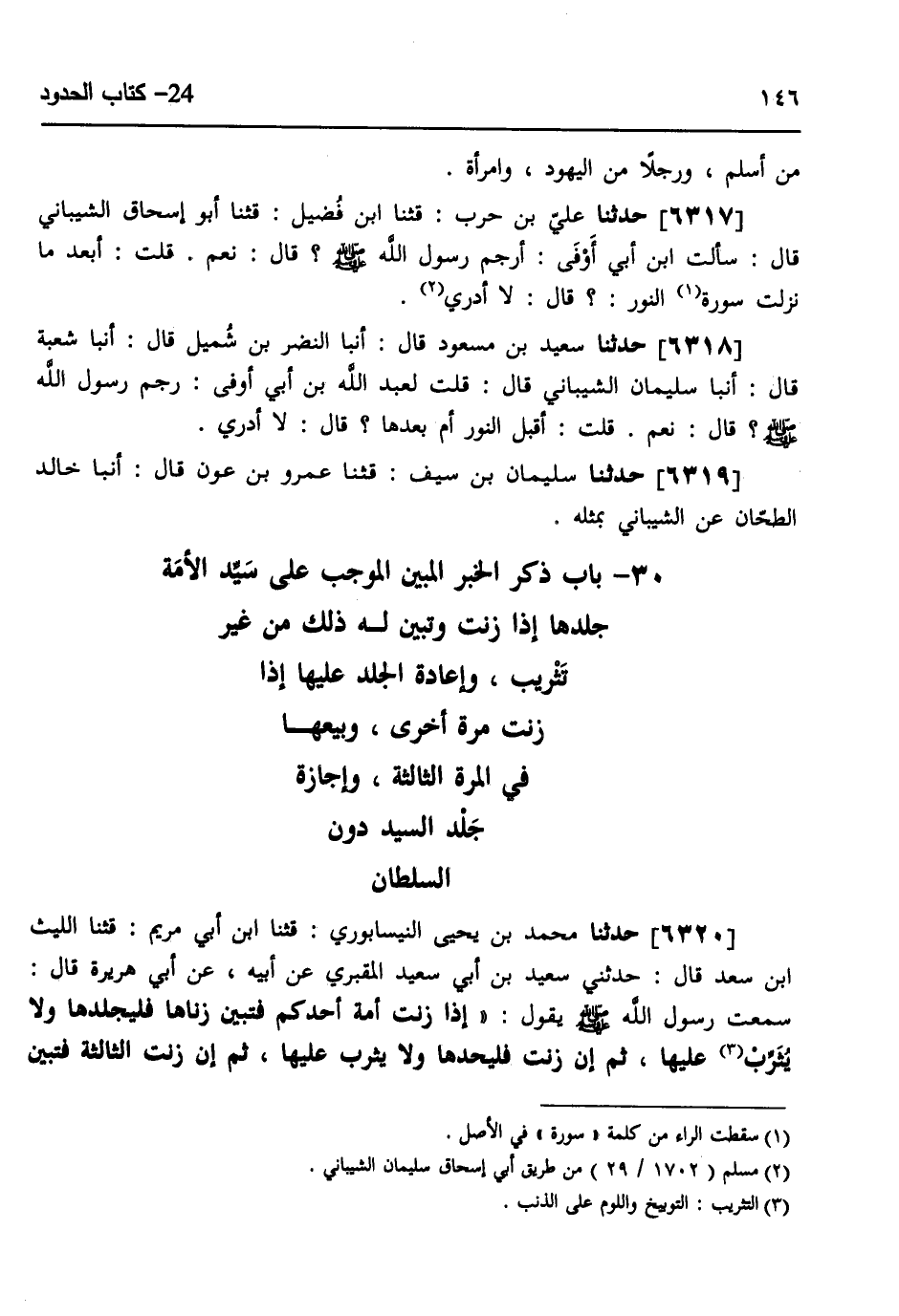 6318 - حَدَّثَنَا سَعِيدُ بْنُ مَسْعُودٍ، قَالَ: أنبا النَّضْرُ بْنُ شُمَيْلٍ، قَالَ: أنبا شُعْبَةُ، قَالَ: أنبا سُلَيْمَانُ الشَّيْبَانِيُّ، قَالَ: قُلْتُ لِعَبْدِ اللَّهِ بْنِ أَبِي أَوْفَى: §رَجَمَ رَسُولُ اللَّهِ صَلَّى اللهُ عَلَيْهِ وَسَلَّمَ؟، قَالَ: نَعَمْ، قُلْتُ: أَقَبْلَ النُّورِ أَمْ بَعْدَهَا؟، قَالَ: لَا أَدْرِي،
